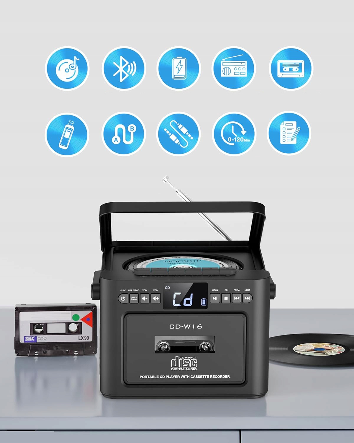 Этот проигрыватель компакт-дисков предлагает несколько вариантов воспроизведения, включая компакт-диски, радио, кассеты, Bluetooth 5.1, USB, AUX и SD-карту. Кассетный проигрыватель оснащен светодиодным дисплеем и пультом дистанционного управления для удобства управления. Легко переключайтесь между песнями, регулируйте громкость и выбирайте различные режимы воспроизведения. С помощью этого многофункционального устройства вы сможете наслаждаться любимой музыкой в различных режимах.