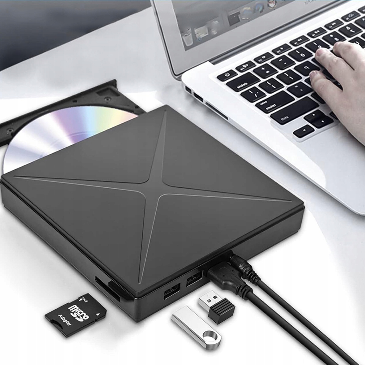 - ✔ его можно использовать не только в качестве внешнего диска CD/DVD, но также позволяет подключать другие устройства к компьютеру, потому что он имеет 2 USB-порты, порт типа C и SD-карта
