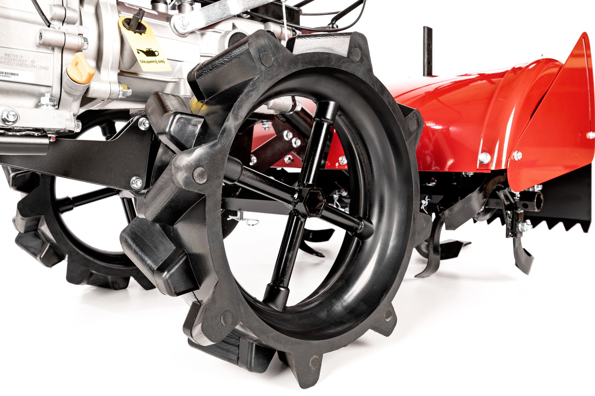 ✅ Привод колес прекрасно поглощает усилия, передаваемые от рабочих ножей, уменьшает усилия при работе и позволяет тщательно рыхлить почву уже за первый рабочий проход. Колеса также облегчают транспортировку машины к рабочей площадке, что делает этот культиватор легким и эффективным.