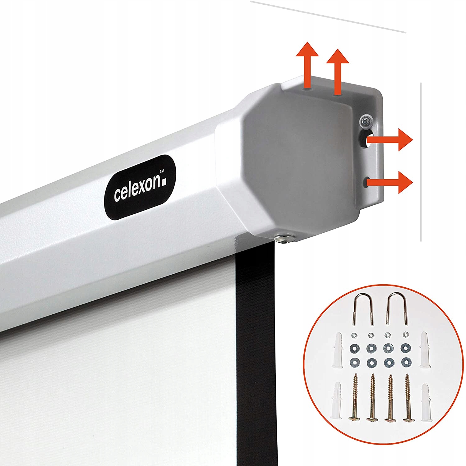 Экран подходит как для настенного, так и для потолочного монтажа. Гнездо для кабеля находится слева, если смотреть спереди.