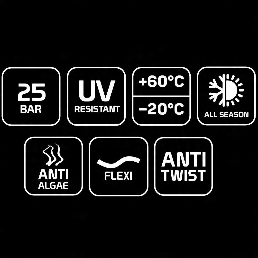 - Устойчивость к УФ и водорослям - - солнечные лучи и осаждения водорослей не влияют на функциональность шланга. В диаметрах 1/2 ", 5/8", 3/4 ", 1", что позволяет вам выбрать правильный вариант. От -20 ° C до +60 ° C, что делает его надежным в течение всего года