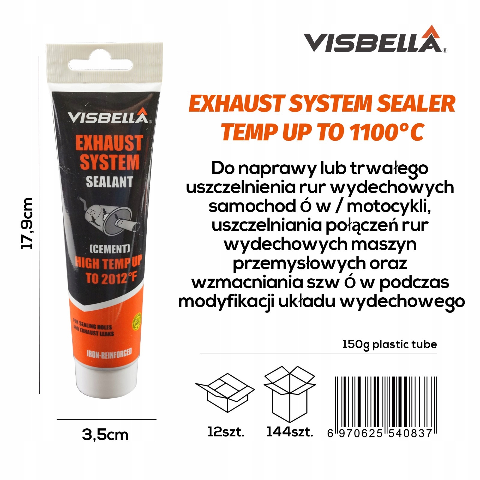 Профессиональный цементный герметик VISBELLA предназначен для высокотемпературного ремонта и модификации выхлопных систем. Устойчив к экстремальным температурам – до 1100°C (2012°F). Армирован железом для повышения долговечности и эффективности.