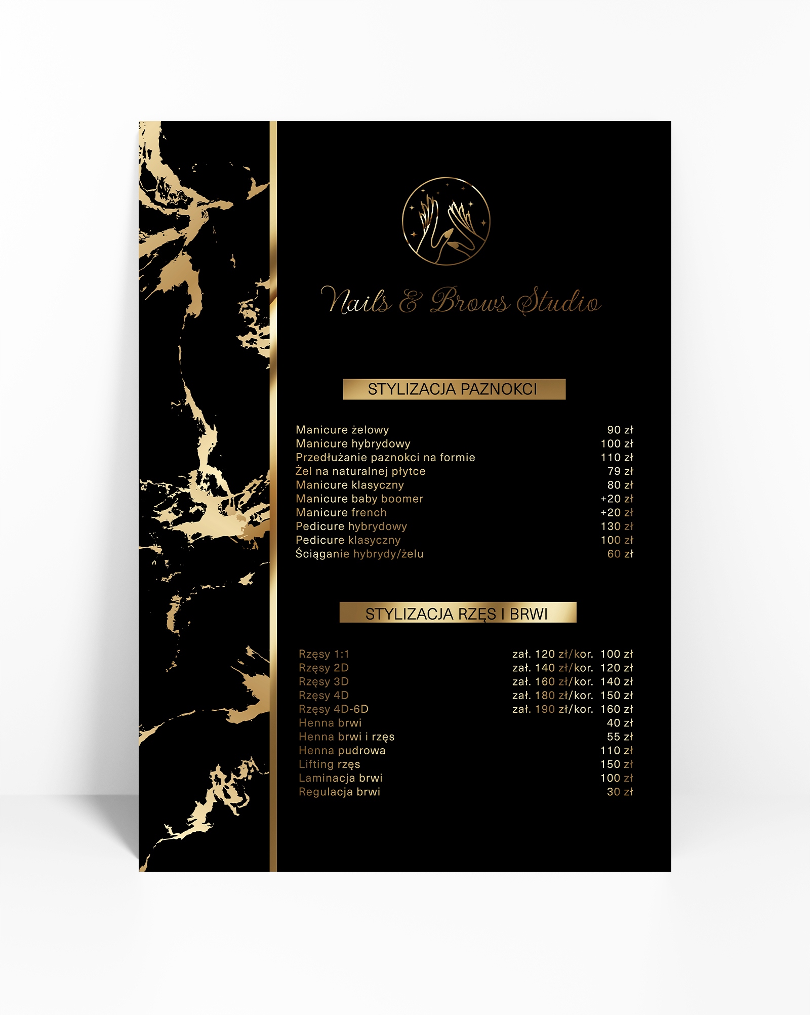 Дизайн с распечатанным по шаблону прайс-листом услуг. Красивый дизайн черного цвета с добавлением золота.