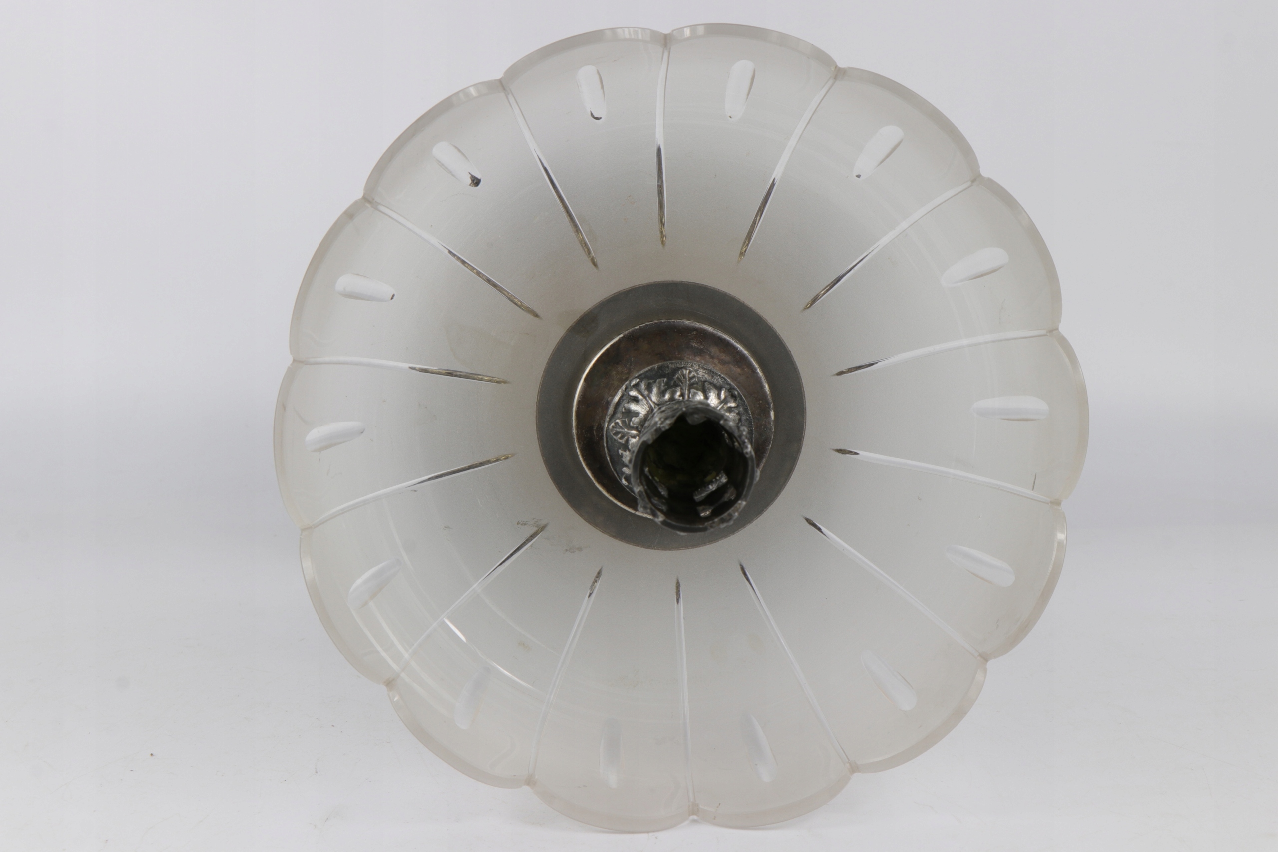 Как видно на фотографиях. Тарелка в хорошем состоянии, имеются минимальные повреждения орнамента в двух местах по верхнему краю жестяной ручки флейты, хорошо заметные на последнем фото. Хрустальная тарелка в хорошем состоянии. Без стеклянной флейты.