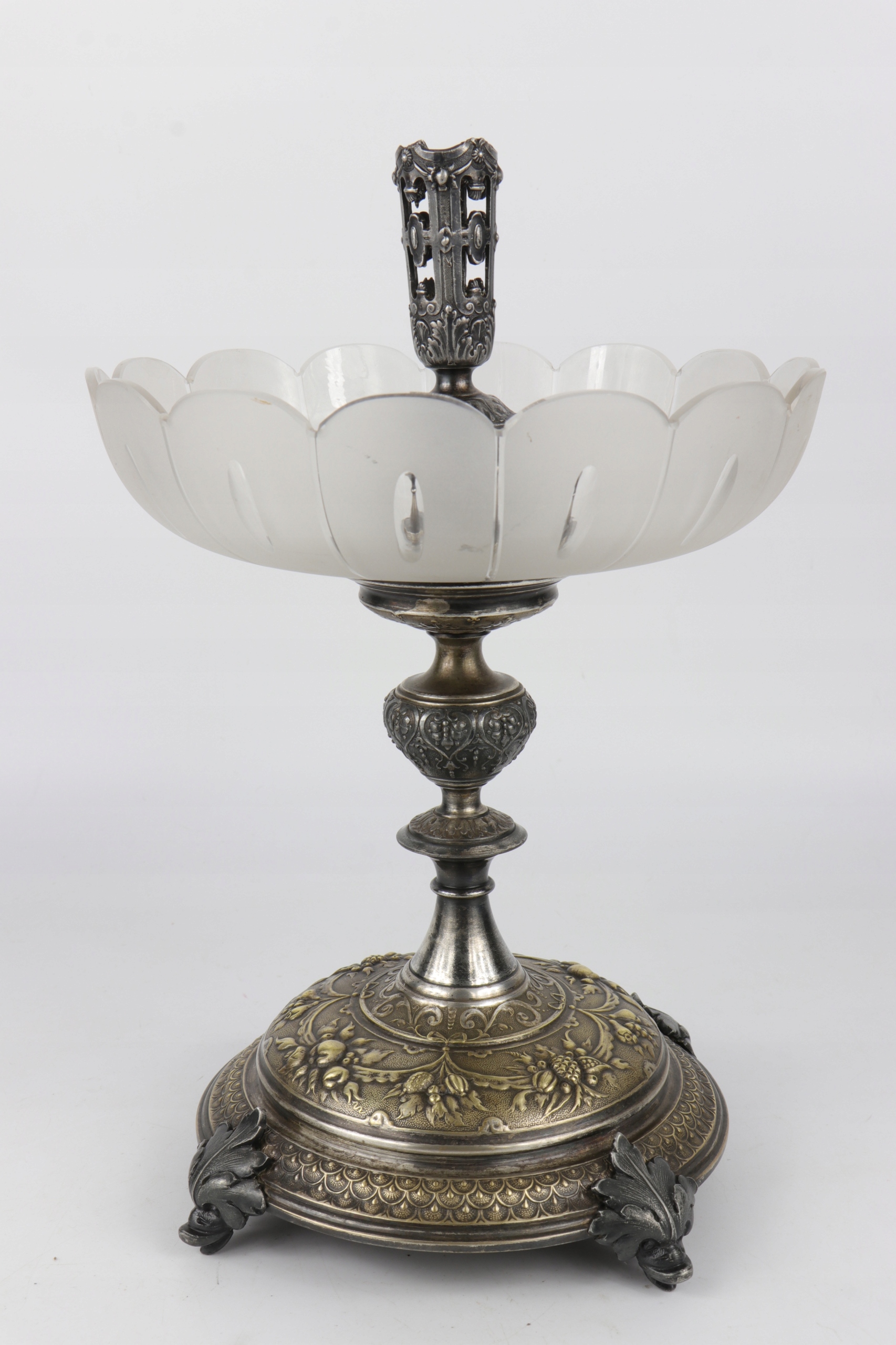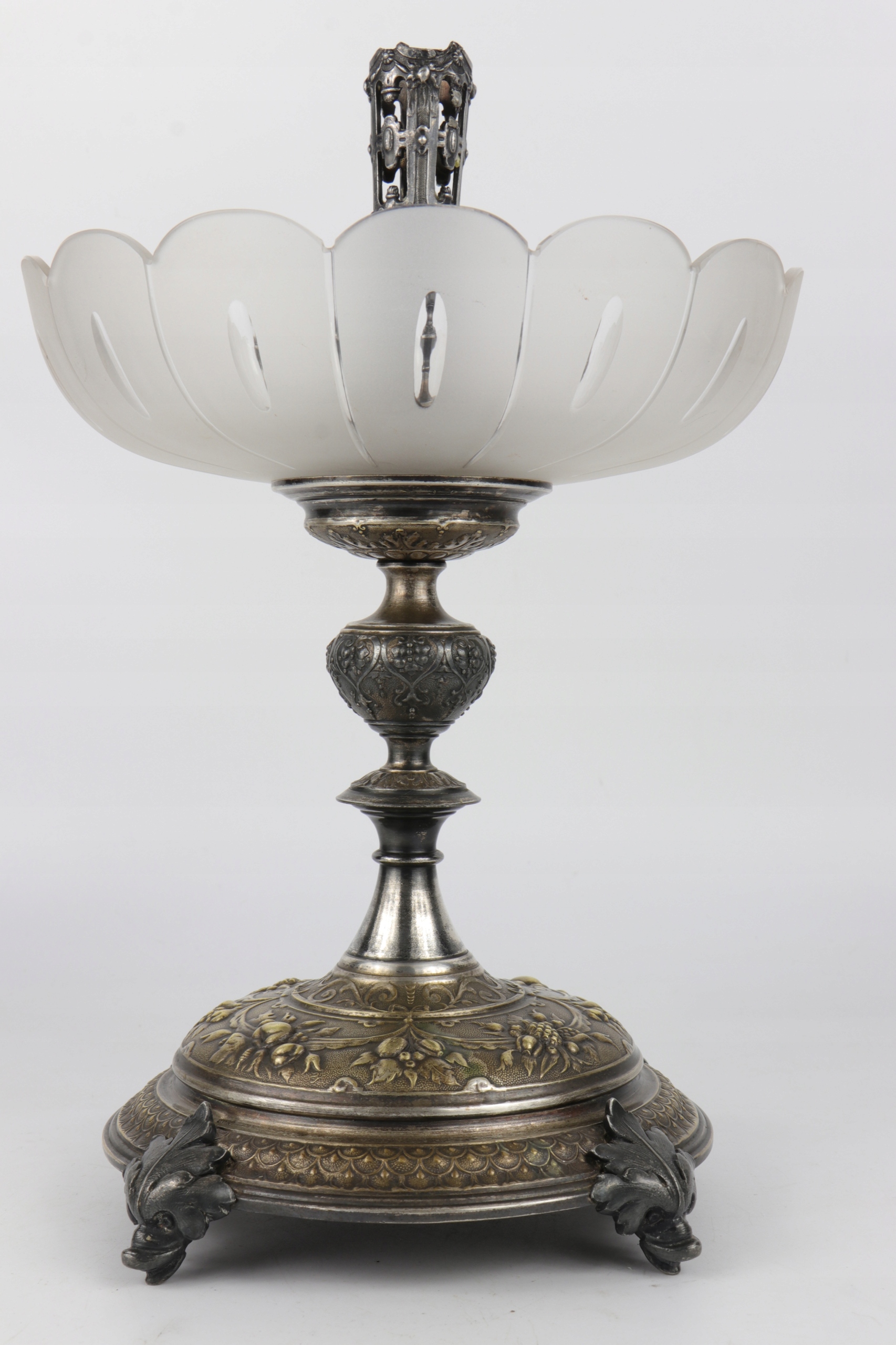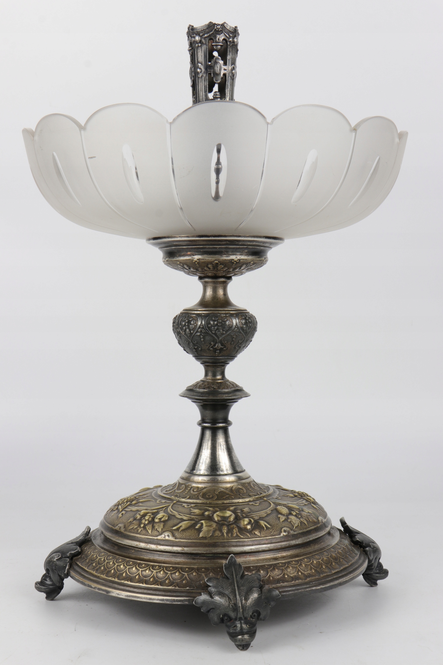 Блюдо в стиле модерн в центре стола, подписанное знаком WMF. Декорации в стиле неоренессанс. Ножки основания украшены головами причудливых дельфинов. Стеклянная тарелка из матового и полированного стекла. В центральной части основание для стеклянной флейты.