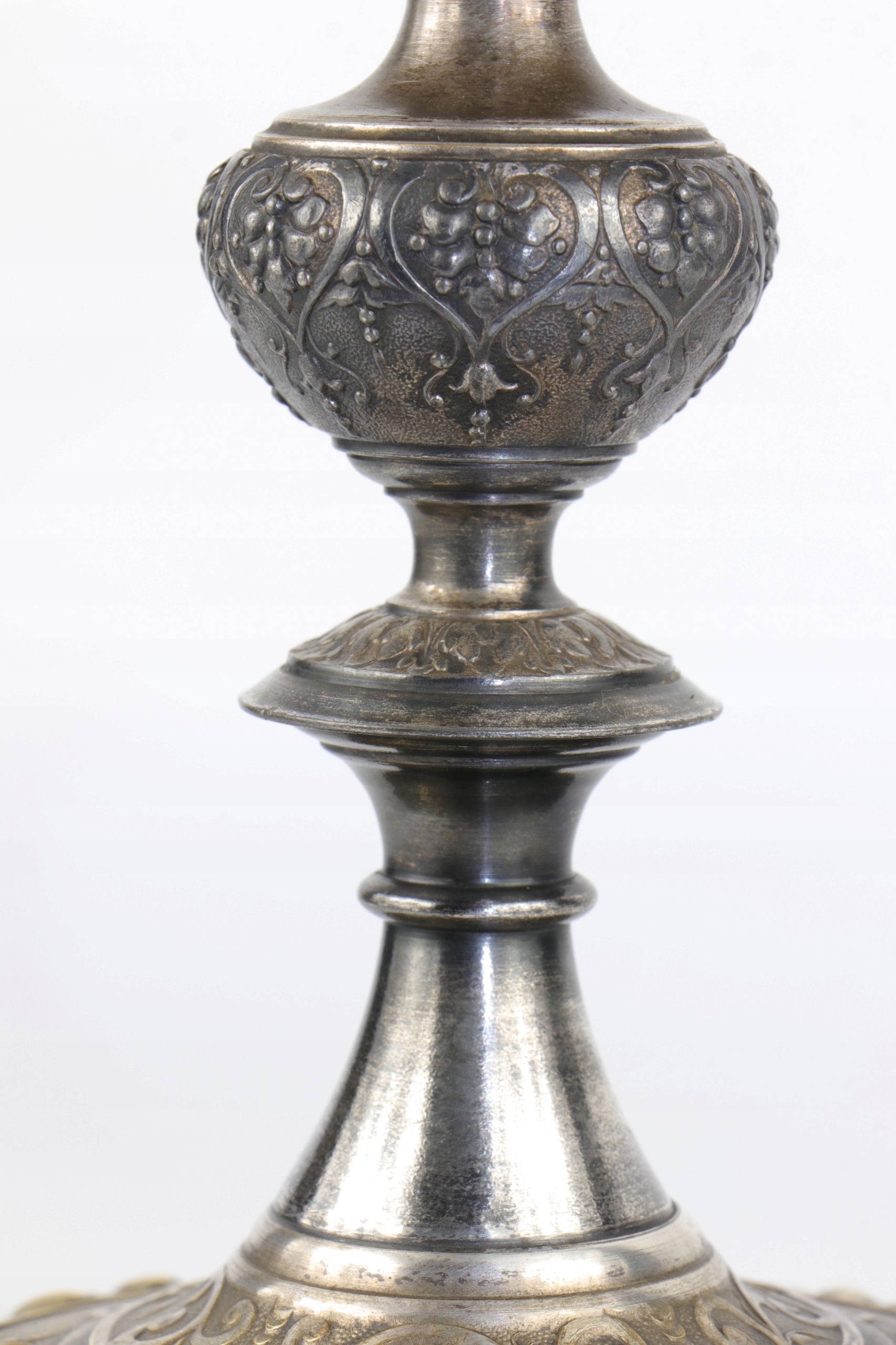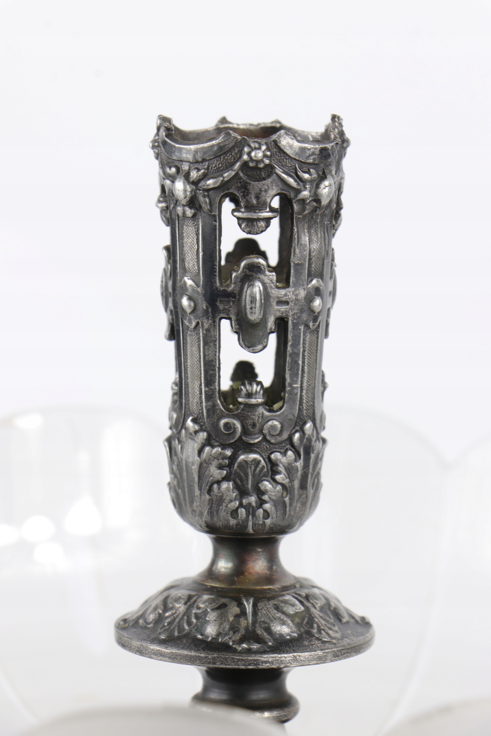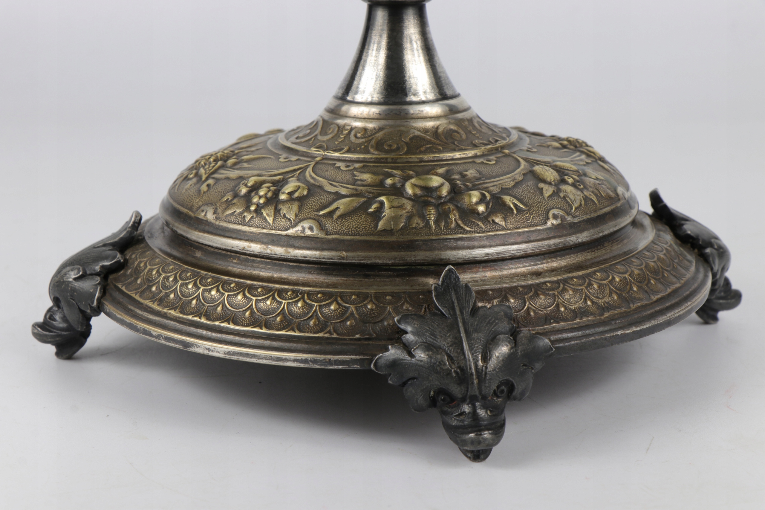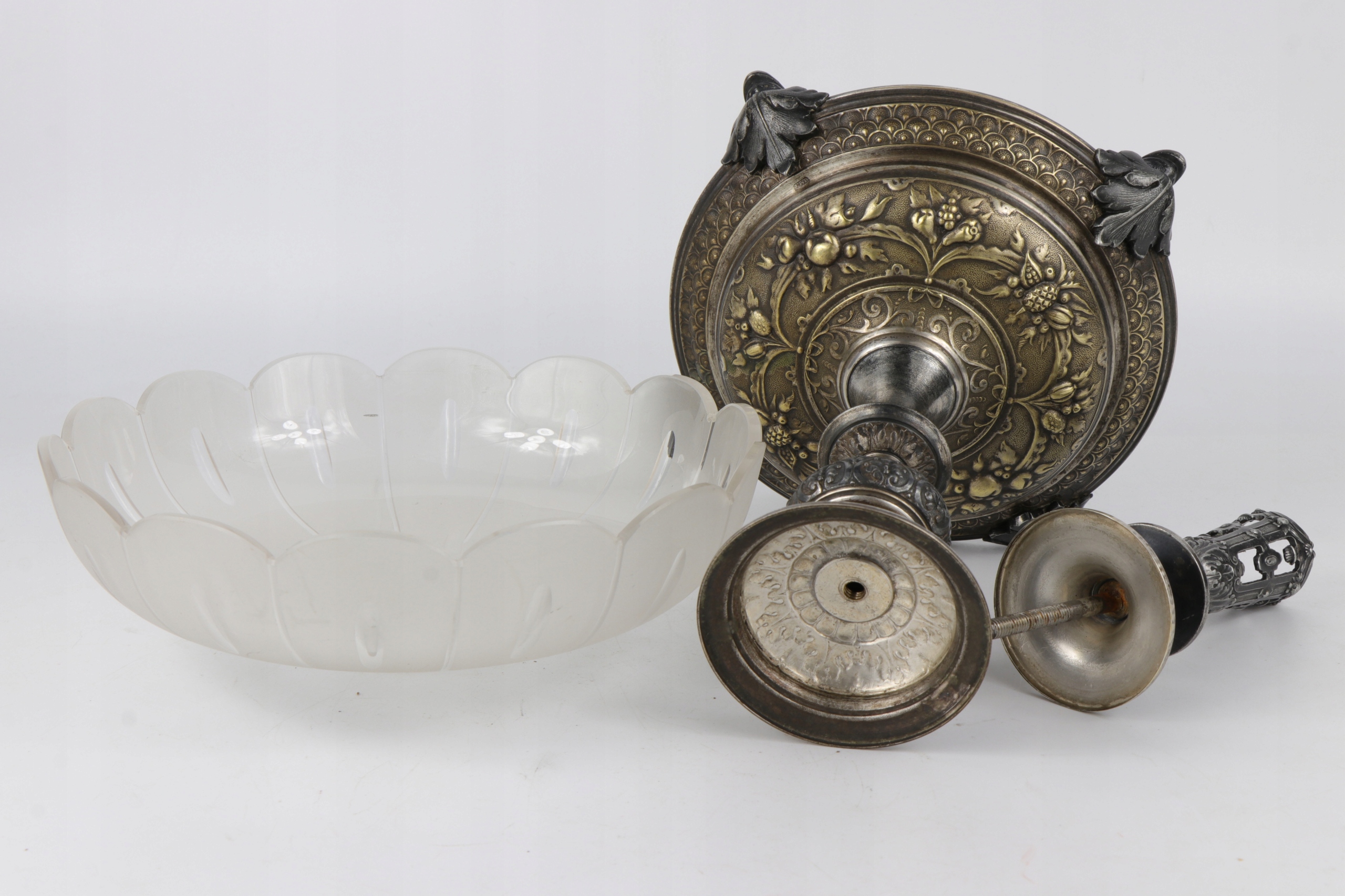 Блюдо в стиле модерн в центре стола, подписанное знаком WMF. Декорации в стиле неоренессанс. Ножки основания украшены головами причудливых дельфинов. Стеклянная тарелка из матового и полированного стекла. В центральной части основание для стеклянной флейты.