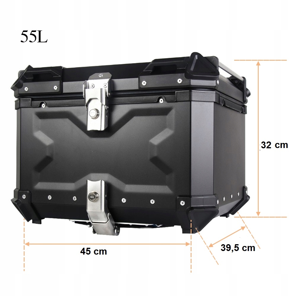 Мотоцикл Бюст BK 55 литров, изготовленных из алюминия, крышки и удаления ствола, закрыта с помощью блокировки, с двумя клавишами и тарелкой для установки в наборе. Лечение. Ширина x Высота)