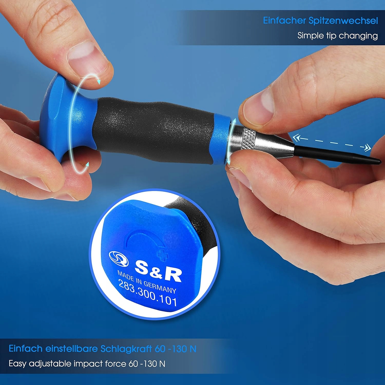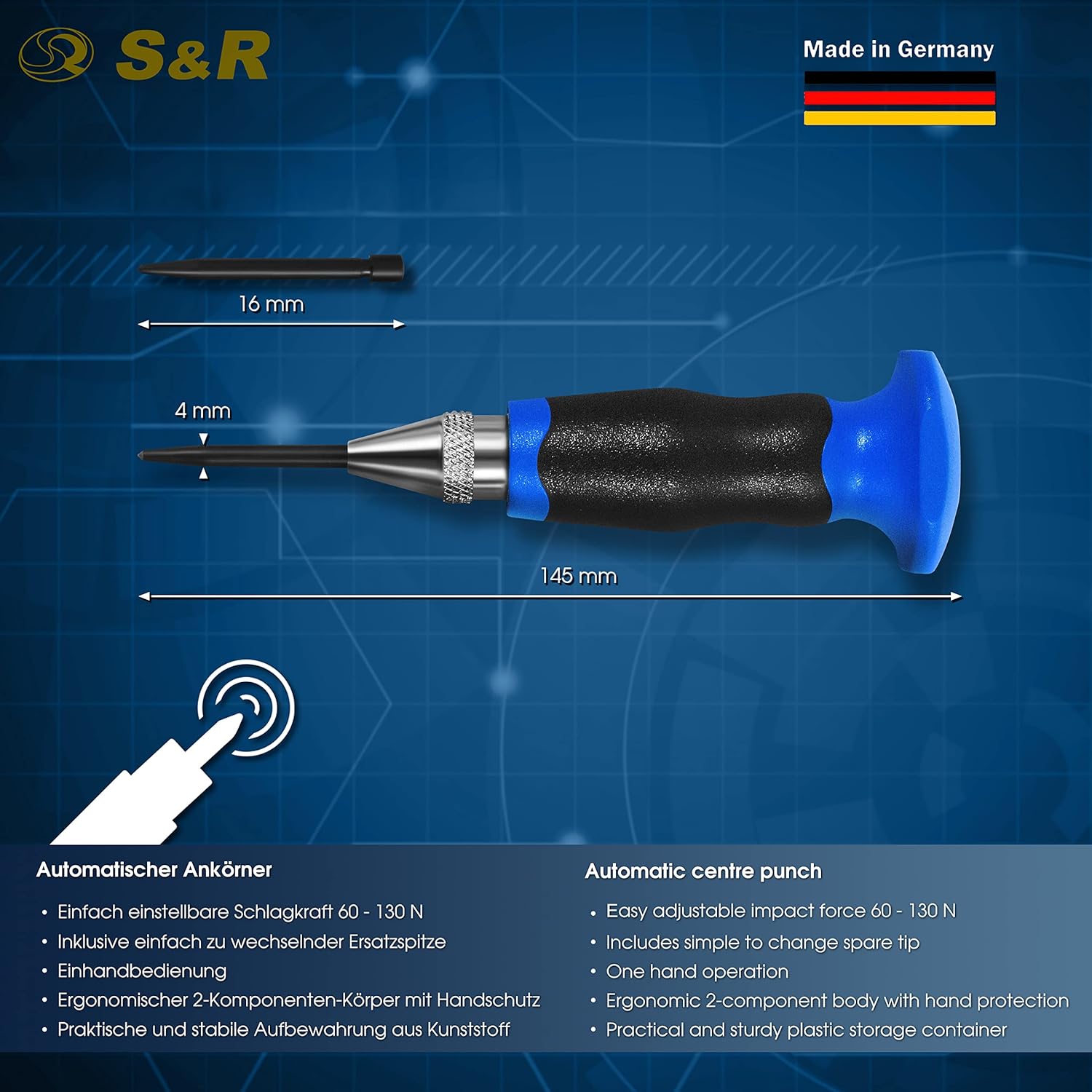 - 🧰 ТОЧНАЯ АВТОМАТИЗАЦИЯ: раскройте всю мощь точности с помощью автоматического кернера S&R. Обновите свой набор инструментов для простой и точной оценки центров. Совершенствуйте свое мастерство с помощью немецкого инженерного искусства!