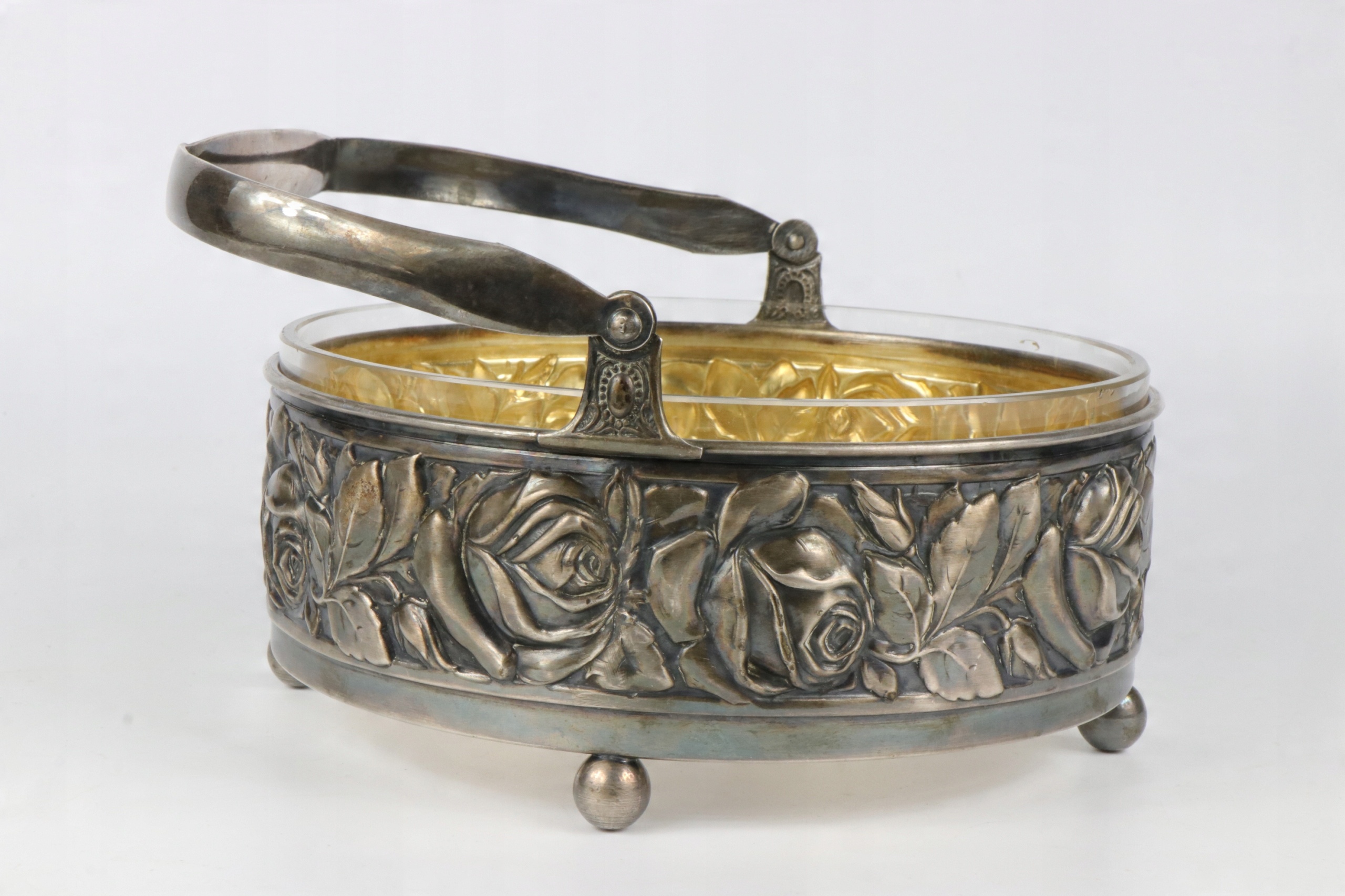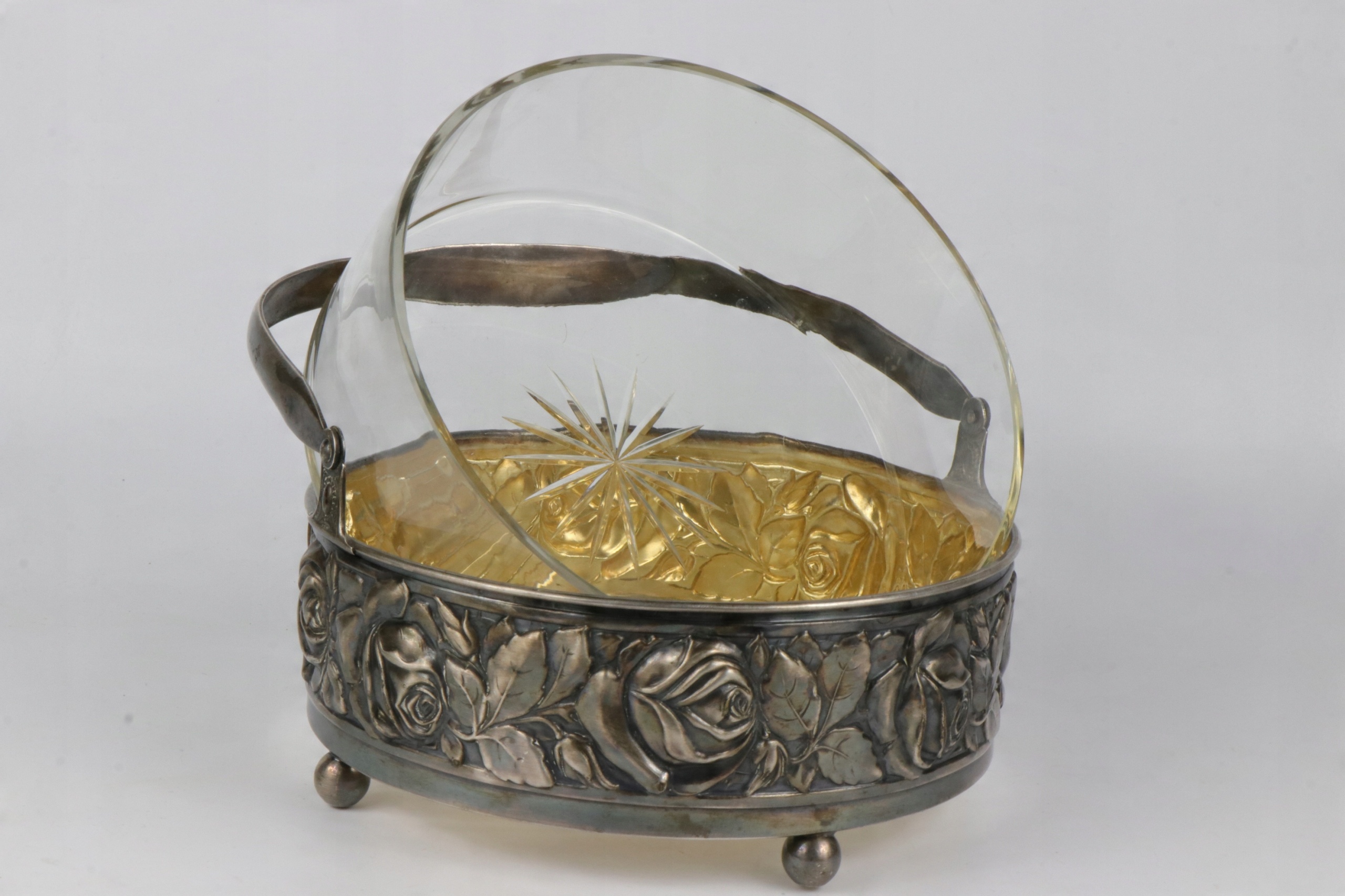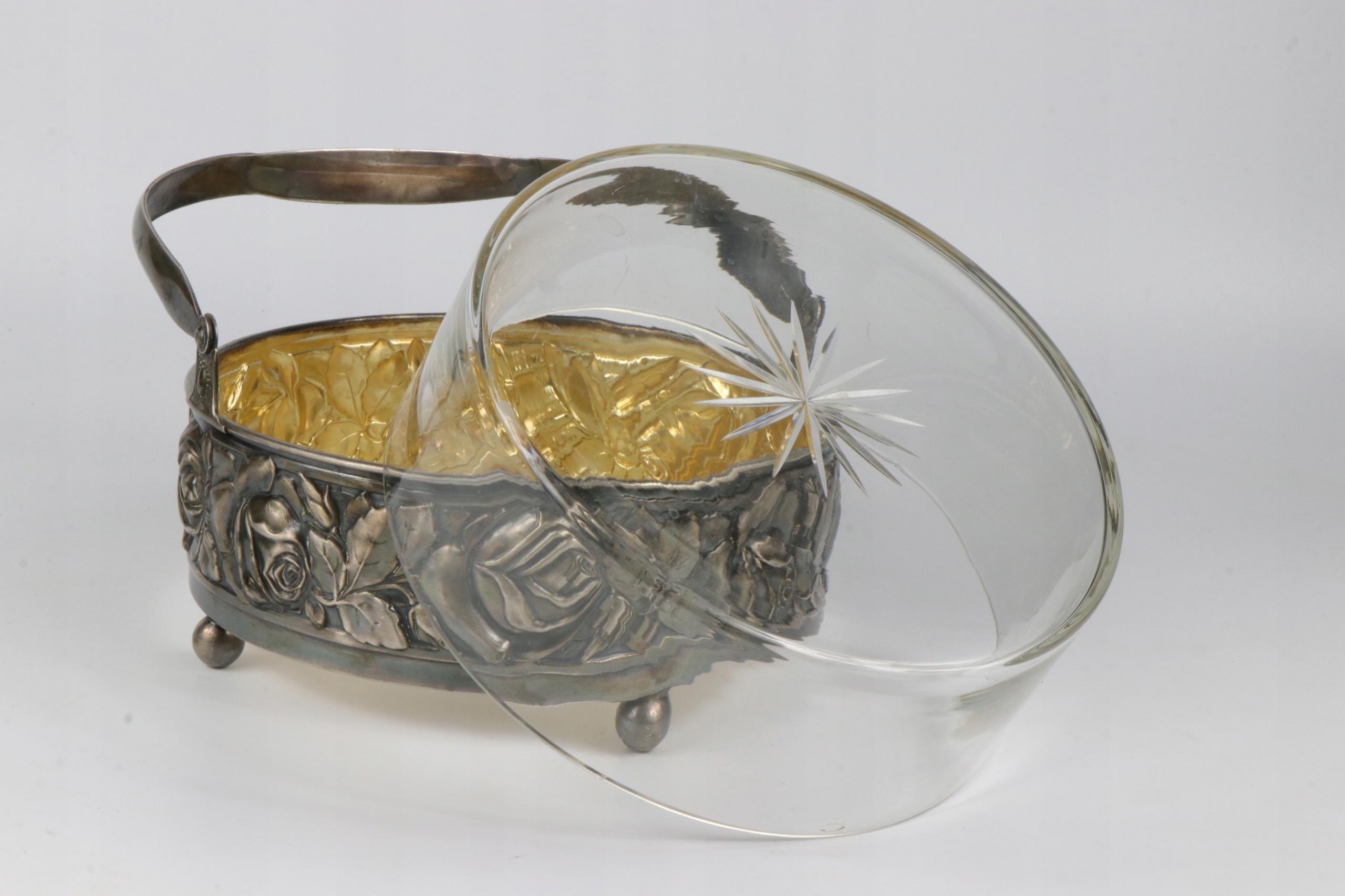 Состояние хорошее, стекло хорошее, трещин нет, минимальный порез на полированной верхней кромке вставки. Блюдо без трещин, серебро хорошей сохранности.
