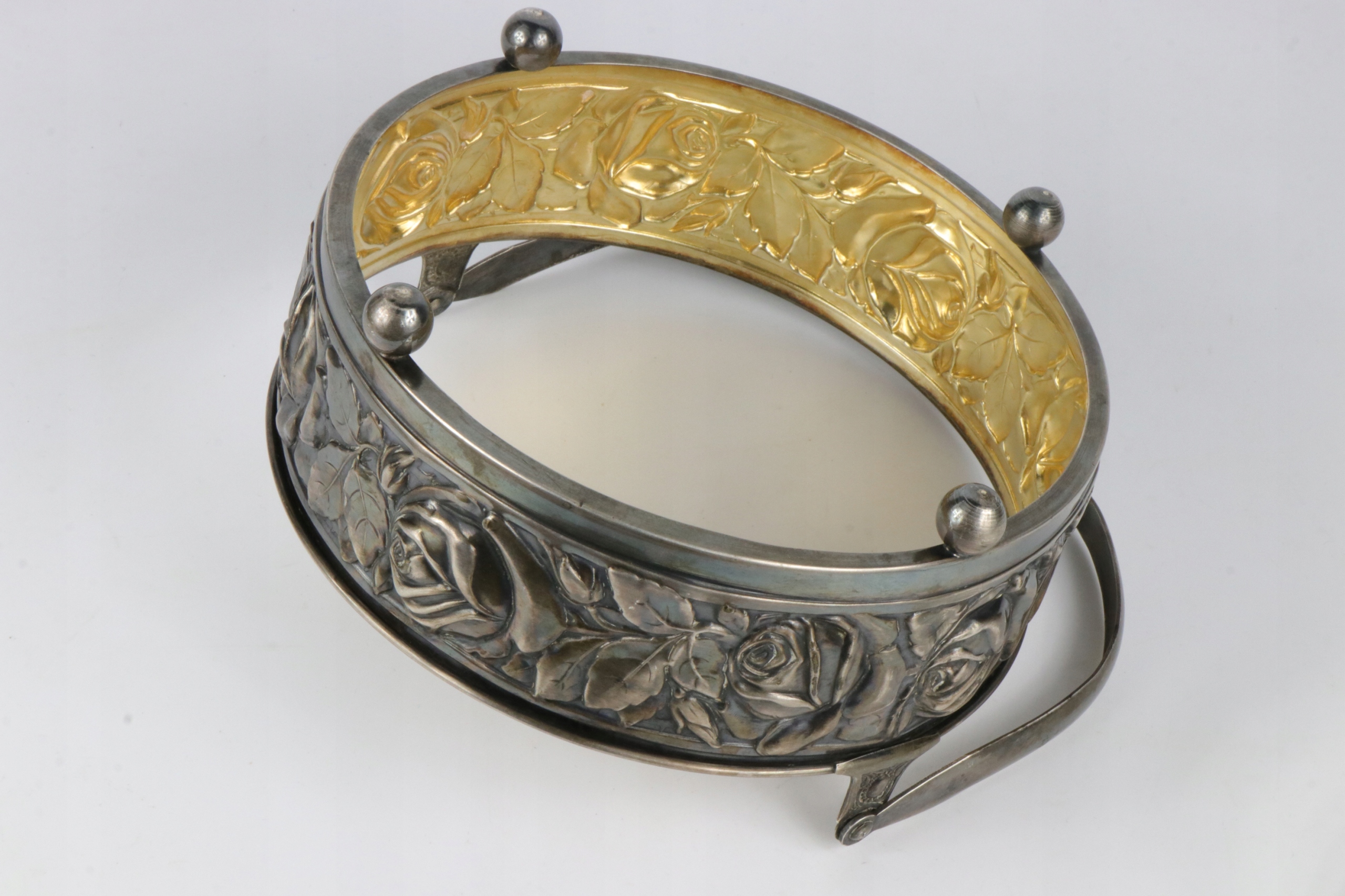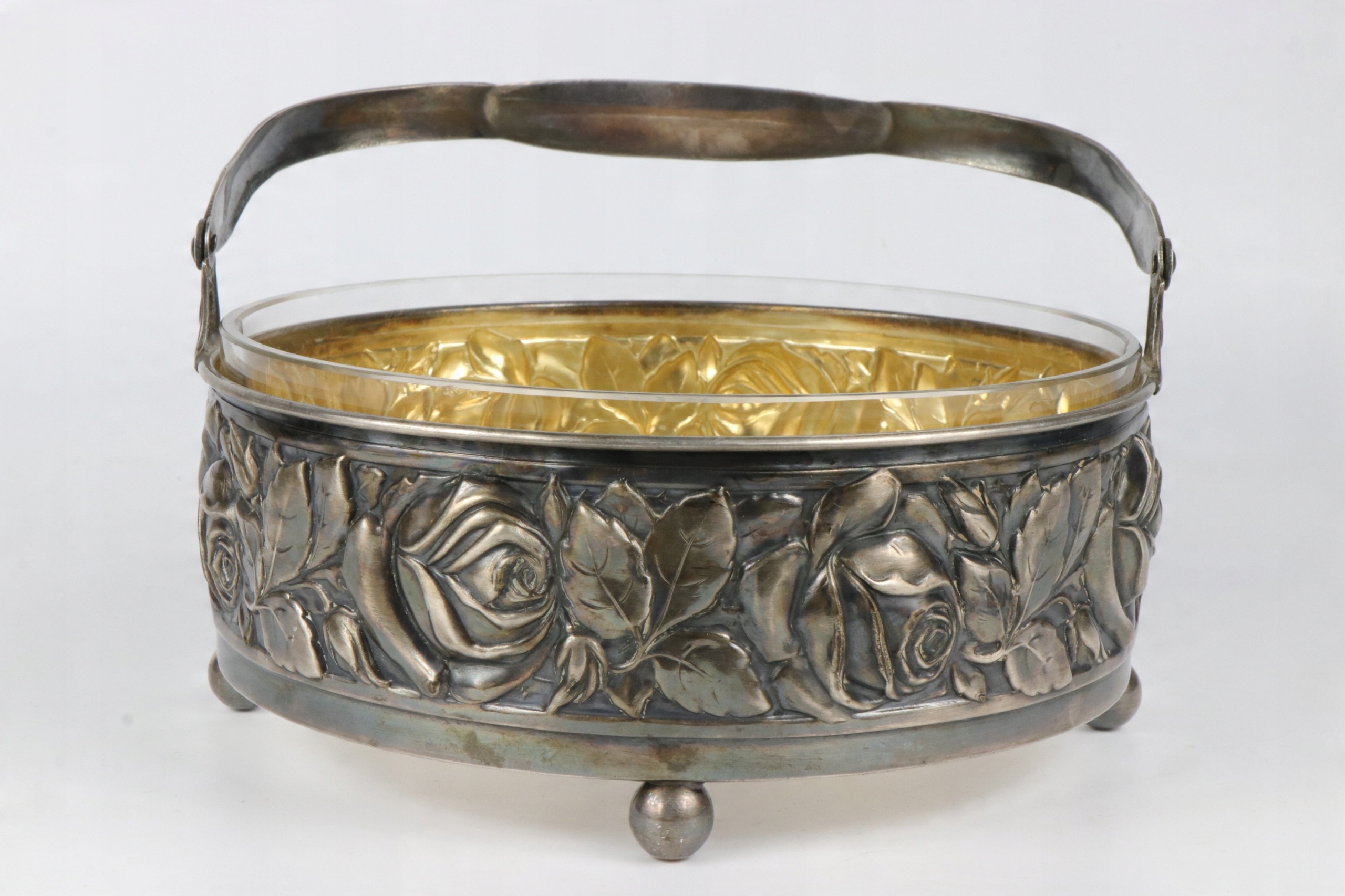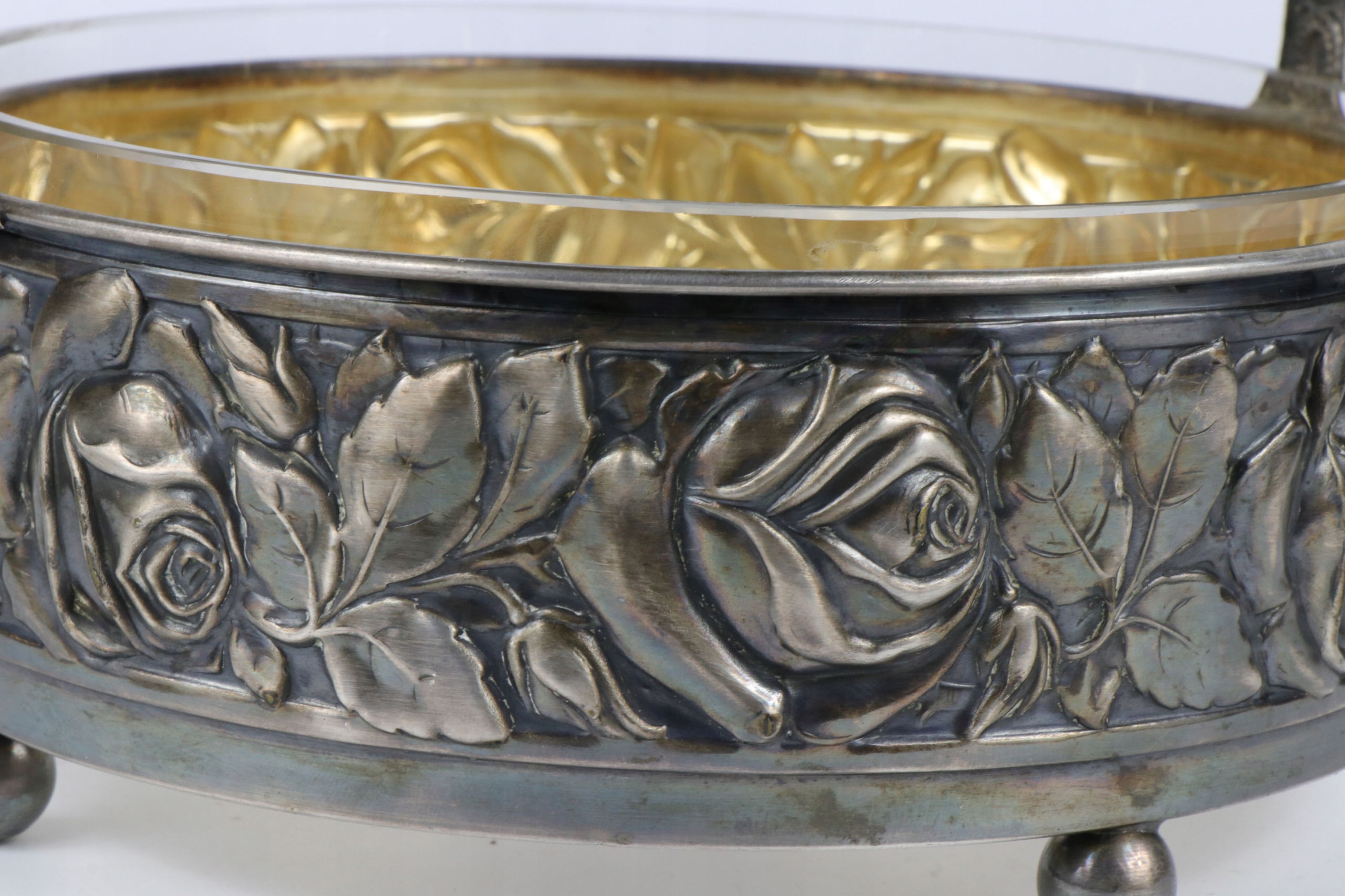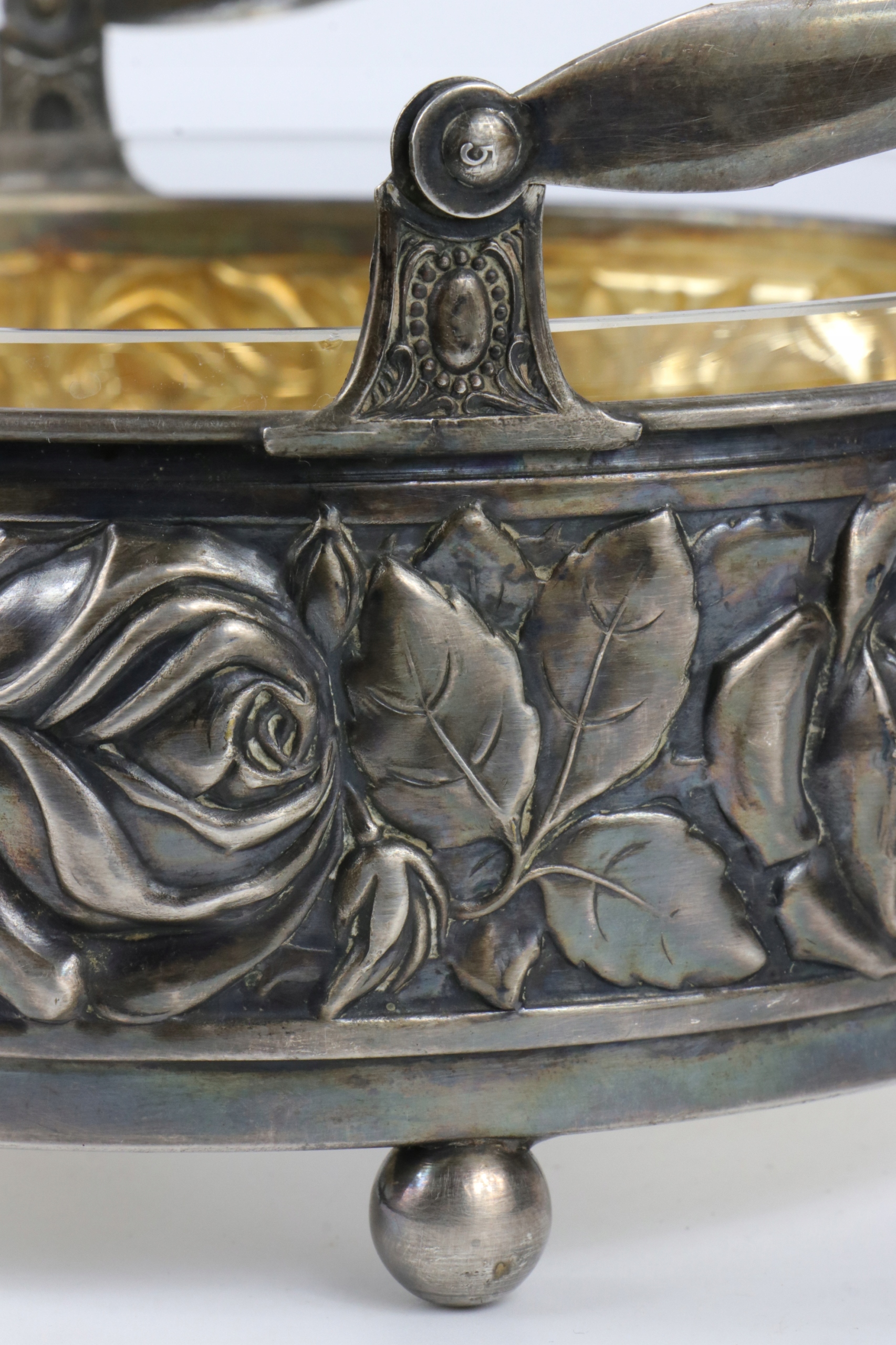 Состояние хорошее, стекло хорошее, трещин нет, минимальный порез на полированной верхней кромке вставки. Блюдо без трещин, серебро хорошей сохранности.