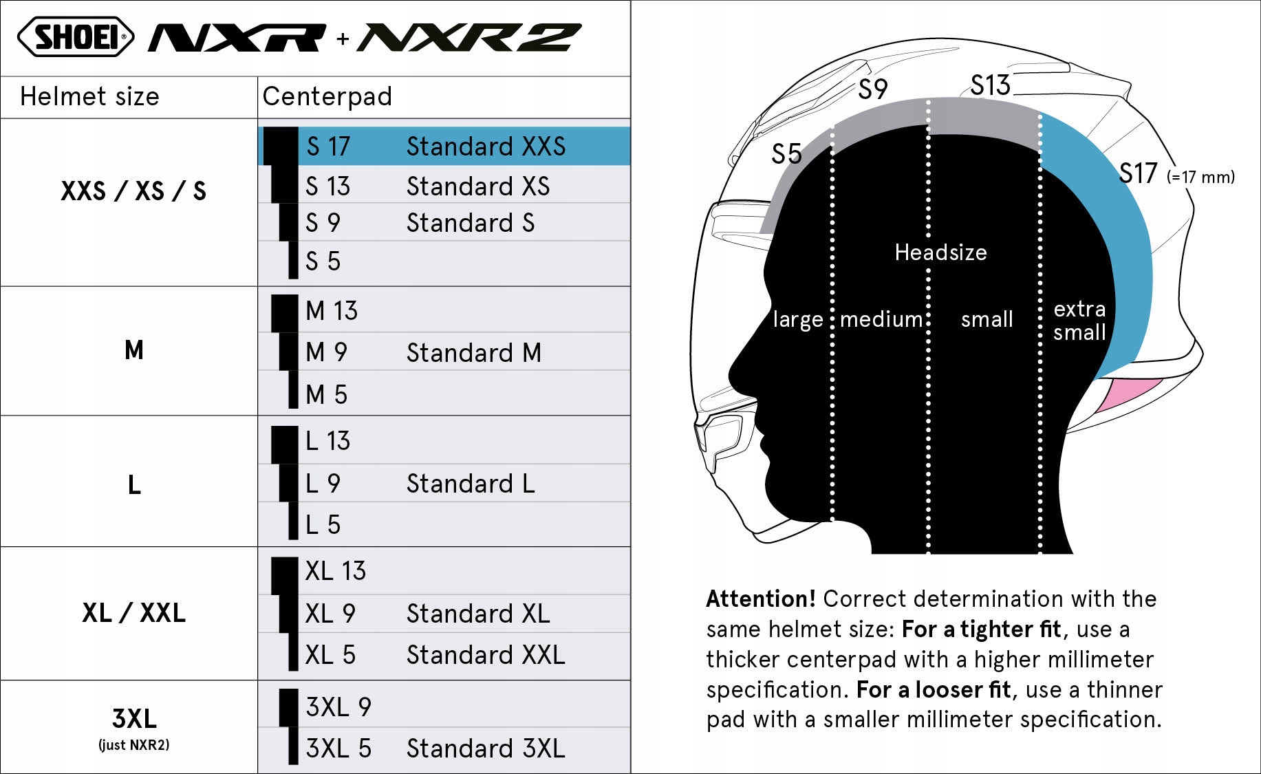 Центральные вставки в различных размерах могут использоваться для замены исходной стельки или для индивидуальной посадки шлема в верхней части головки. Подкладка данной модели шлема может быть упомянута в терминах размера, например, "Xl5" - "xl9" - "xl13". «XL5» означает более тонкий, «XL13», более толстая подкладка, как показано в таблице ниже.