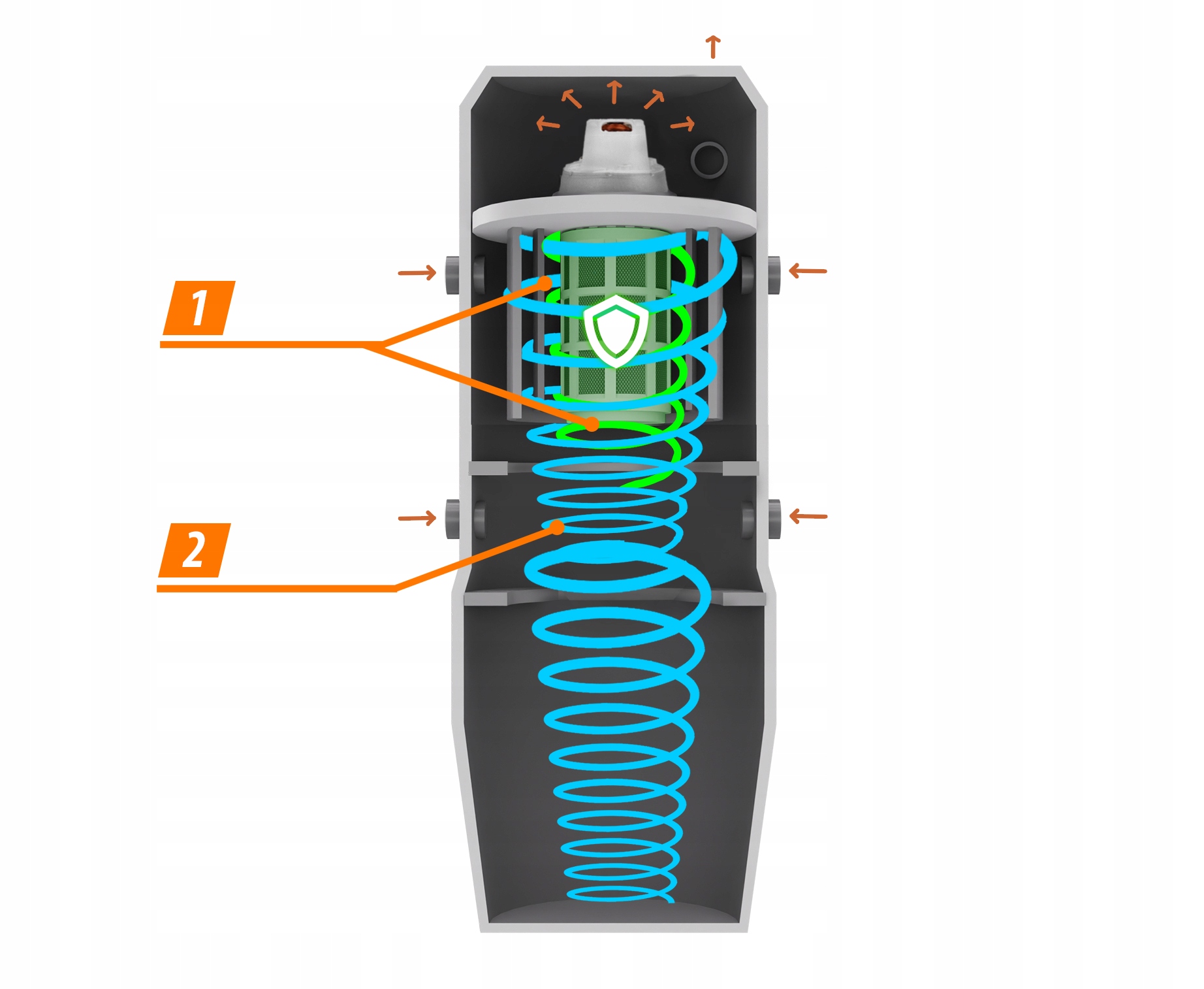 Наш пылесос оснащен двойной циклонной фильтрацией, которая использует центробежные силы для эффективного отделения загрязнений из воздуха. Благодаря использованию двойной циклонной фильтрации загрязнения направляются прямо в резервуар для мусора, а стенки пылесоса и его компоненты остаются чистыми.