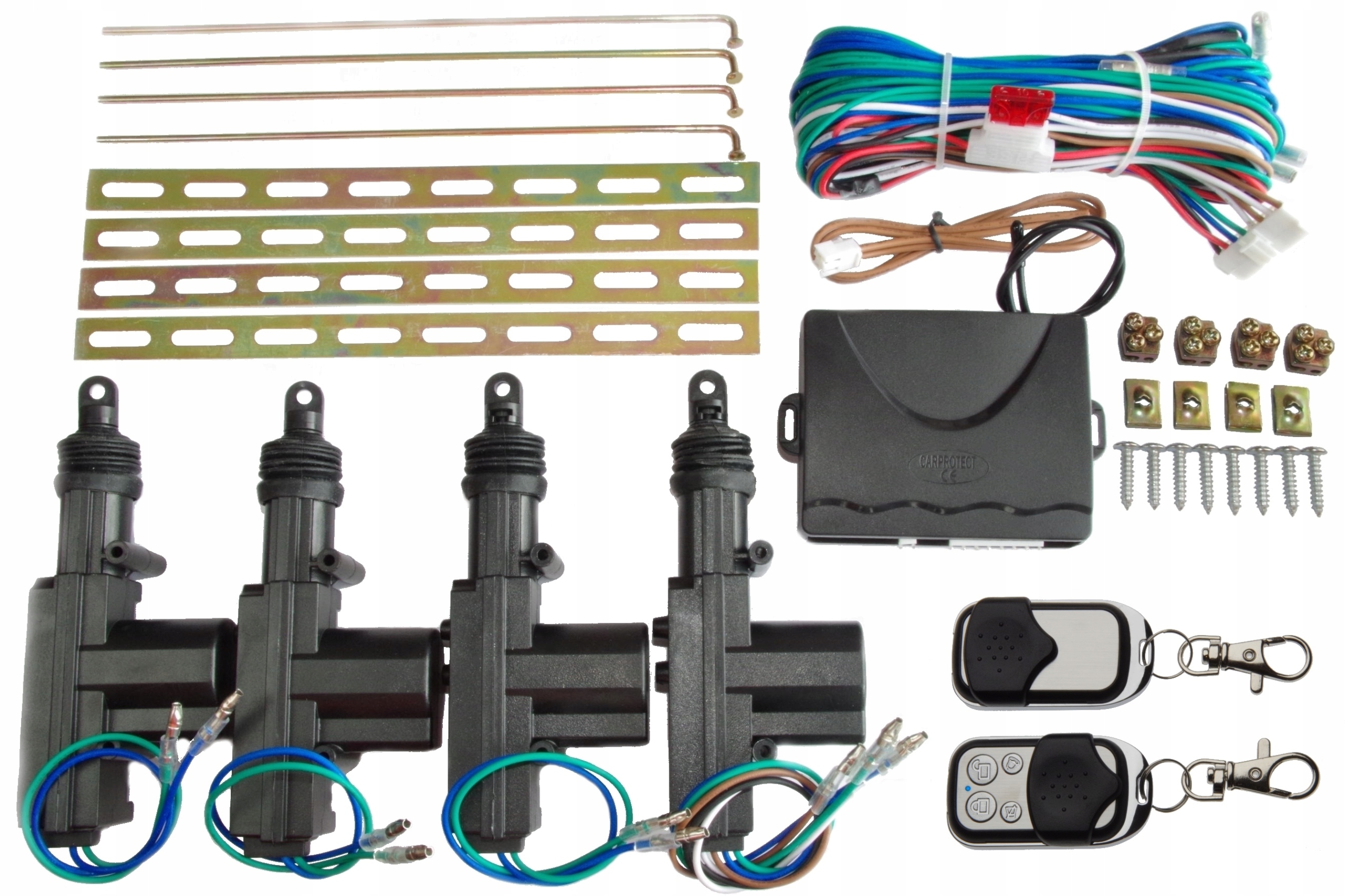 Комплект ГОМОЛОГИРОВАННЫХ (сертификат Е20 № 10R-03 2731) универсального центрального замка компании CARPROTECT. Это модель РАПТОР с 4 дверями, управляемыми с помощью пульта дистанционного управления. Контроллер очень прост в установке. Для электрического подключения требуется всего 2 провода (+12 В, масса).Дополнительно можно подключить указатели поворотов или габаритные огни (разъем входит в комплект). Замком можно управлять как с ключа от двери водителя, так и с пульта. Также он имеет дополнительный выход для управления поворотниками или габаритными огнями и вход для управления с другого устройства (сигнализация, переключатель и т.п.).