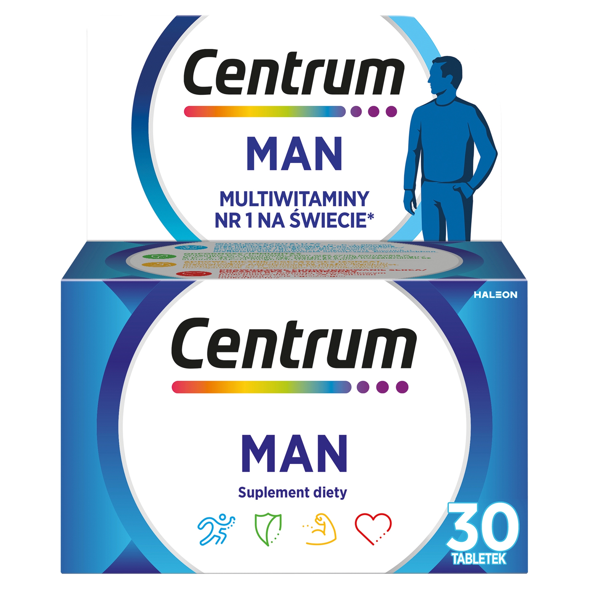 Биологически активная добавка Centrum MAN представляет собой полный набор витаминов и минералов, адаптированный к особым потребностям мужчин в питании. Усовершенствованная формула Centrum Man была разработана для ежедневного поддержания мужского здоровья и благополучия. • Добавка содержит большую дозу магния, витамина B1 и ниацина. Витамины группы В (В1, В2, В6, В12) и магний способствуют нормальному энергетическому обмену. • Кальций и магний способствуют правильному функционированию мышц. Кроме того, витамин D способствует поддержанию правильного функционирования мышц. Рекомендуемая суточная доза: Принимайте по 1 таблетке в день. Не превышайте рекомендуемую суточную дозу. Безопасное использование: разнообразное и сбалансированное питание и здоровый образ жизни очень важны, поэтому этот продукт не следует использовать в качестве замены разнообразного питания. Не применять при повышенной чувствительности к любому из ингредиентов препарата. Хранение: Хранить в сухом месте, при температуре не выше 25⁰С. Хранить в недоступном для маленьких детей месте. Не используйте, если фольга на упаковке повреждена. После использования тщательно закройте крышку. Биологически активная добавка не может использоваться в качестве замены разнообразного питания. Сбалансированное питание и здоровый образ жизни важны для правильного функционирования организма. Хранить при комнатной температуре, в недоступном для маленьких детей месте.