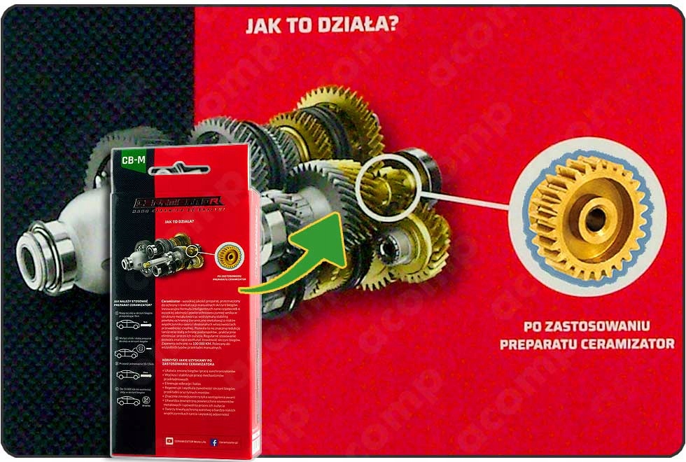 Работа продукта на практике была представлена в TVN TURBO, GALILEO и на канале YouTube. . Керамические наночастицы, содержащиеся в CERAMIZER, смешанные с маслом, распределяются по деталям шестерни и моста. Оседая на поверхностях, под воздействием температуры и давления они связываются с металлом. Таким образом, создавая новый слой, они герметизируют и разглаживают поверхности, уменьшаятрение. Улучшается подгонка взаимодействующих элементов коробки и моста, что приводит к более плавной работе и увеличению срока службы их деталей. CERAMIZER имеет шанс в более старой коробке передач улучшение переключения передач и снижение шума ее работы.