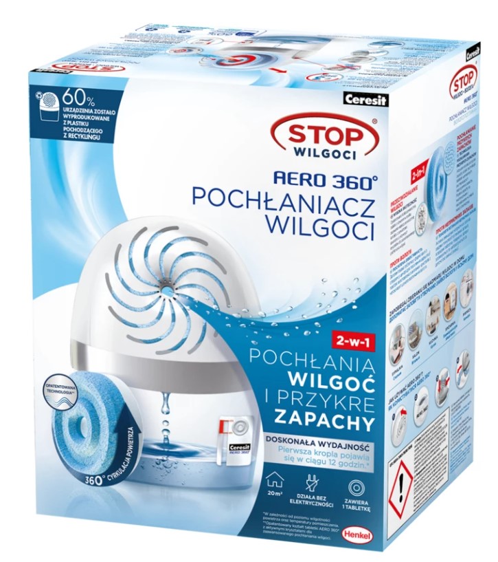 Aero 360 ° Устройство - это революция в области управления влаги. Новая система Henkel обеспечивает оптимизацию циркуляции воздуха 360 °. Система Aero 360 ° работает на основе принципов физики - чем больше таблетки площади контакта с воздухом, тем больше сила для поглощения влаги. Аэродинамическое устройство имеет уникальный воздушный туннель на 360 °, позволяющий воздуху течь с каждой стороны и через центр подвесной планшеты.