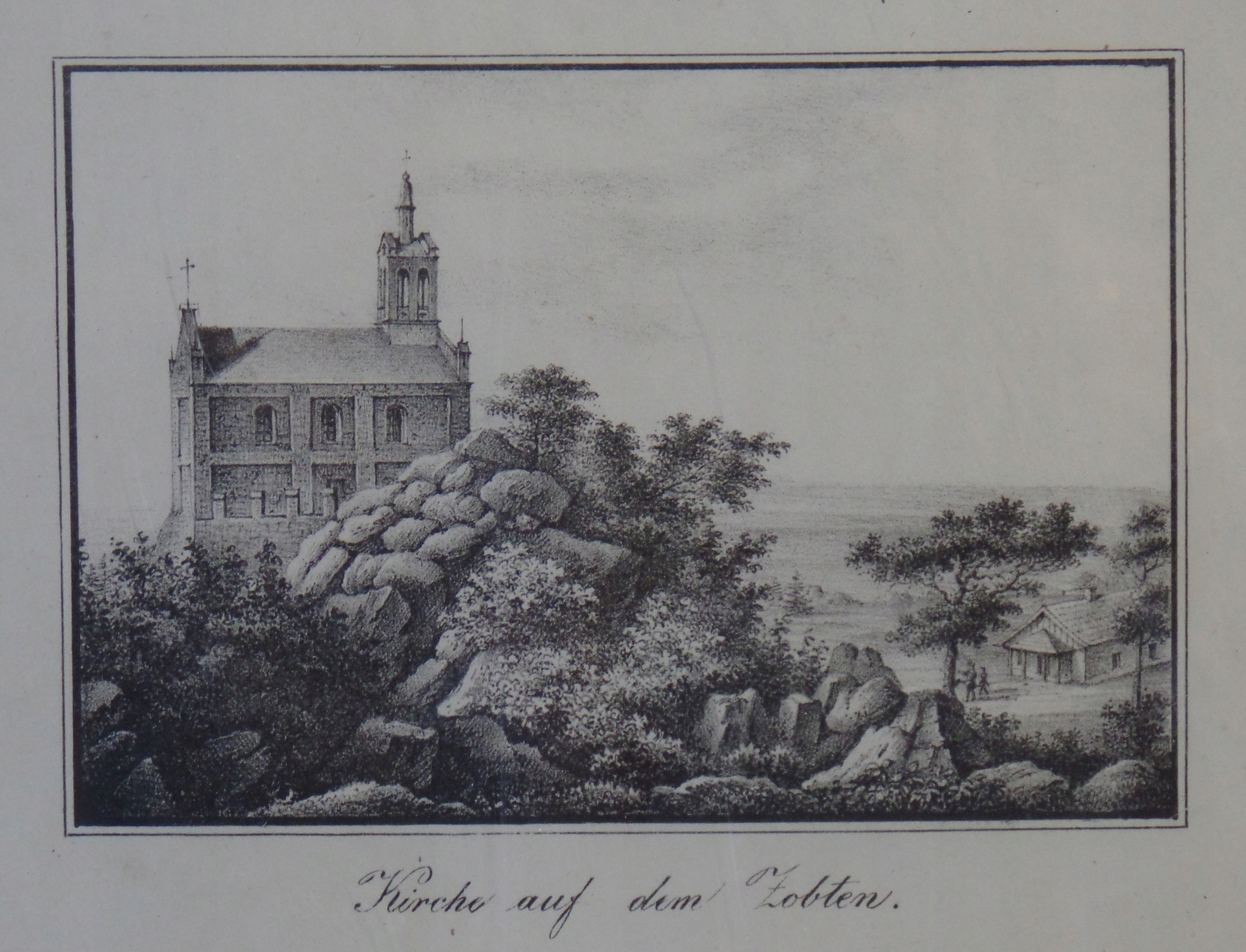 "Церковь посещения Пресвятой Девы Марии на ślęza" литографии на пап. О измерениях 7,5 х 11 см (производительность) с подписью внизу "Kirche auf dem nobten". Необработанная работа была создана в середине XIX века. Вероятно, в издательском доме Эрнста Книппеля в Ковари, что предполагает формат и развитие. Размеры в кадре 23 х 26,5 см.