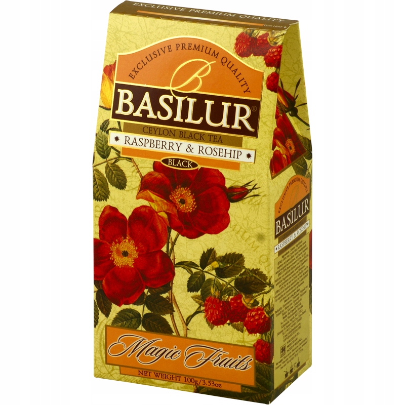 Чай Basilur Raspberry & Rosehip — элитный черный крупнолистовой чай сорта FBOP с добавлением плодов малины, папайи и шиповника. Обозначение FBOP представляет собой аббревиатуру Flower Broken Orange Pekoe, что означает, что для производства чая использовались сломанные верхние листья куста и бутоны (кончики). Чай отличается сильным, характерным ароматом и фруктовым вкусом. Чай Basilur упакован в декоративную коробочку, что делает чай идеальным в качестве подарка.