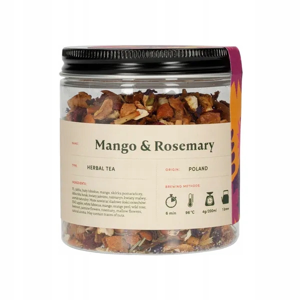 - Состав : Яблоки, белый гибискус (5,8%), манго (5,8%), цедра апельсина, шиповник, свекла, ароматизатор, цветы жасмина, розмарин, цветы мальвы. Может содержать следы орехов.