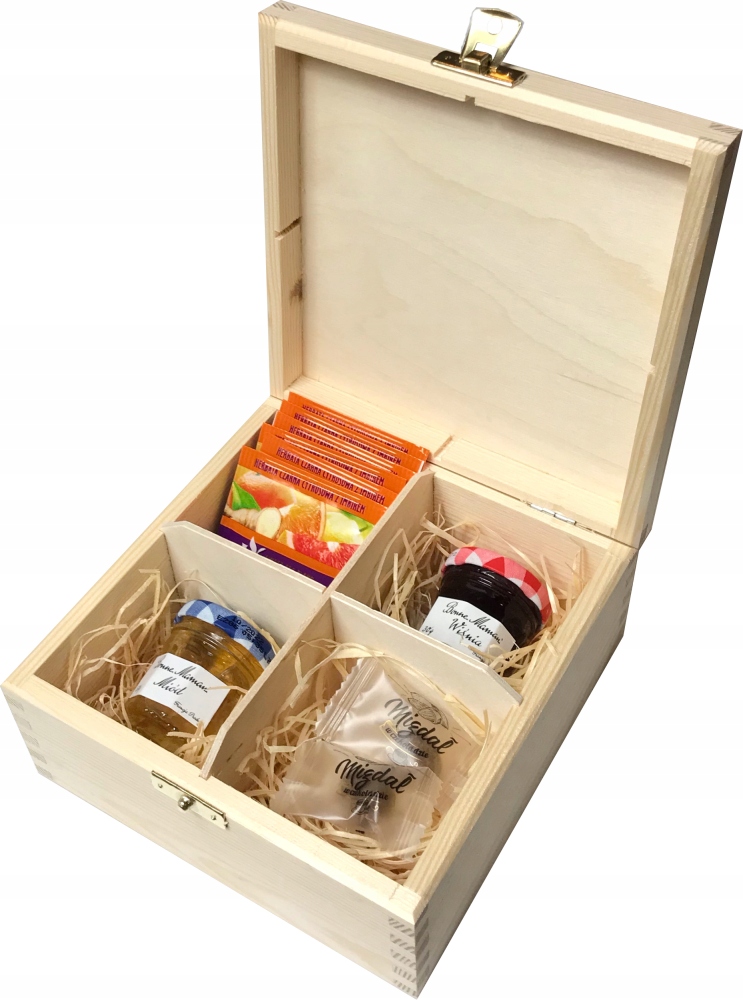 Набор состоит из деревянной подставки для чая с 4 отделениями. В отделениях можно найти чай, мед, фруктовое варенье и сладости.