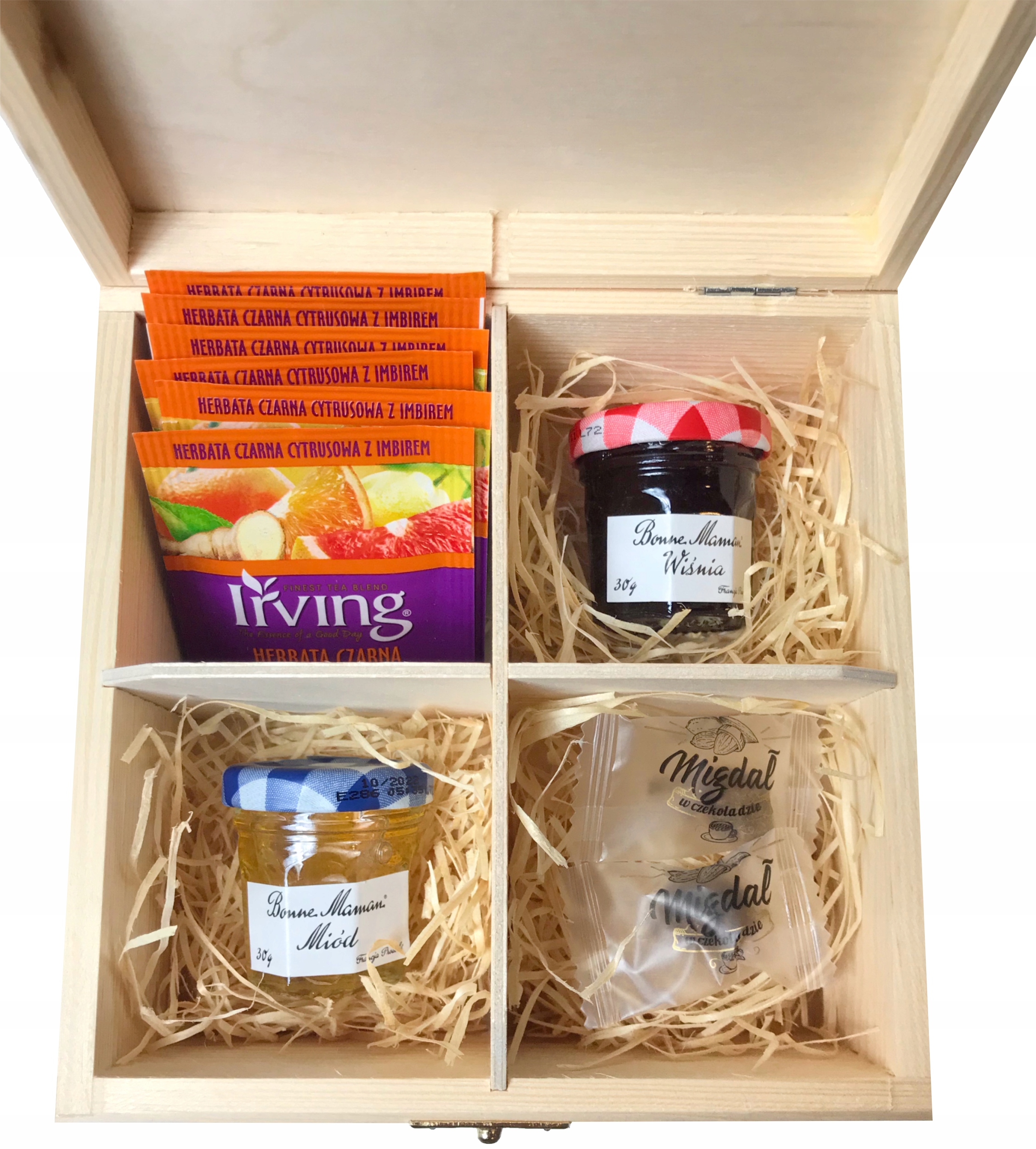 - 6 шт ароматизированного чая Ирвинг, мед натуральный 30г, джем фруктовый 30г, миндаль в шоколаде с корицей 2 шт.