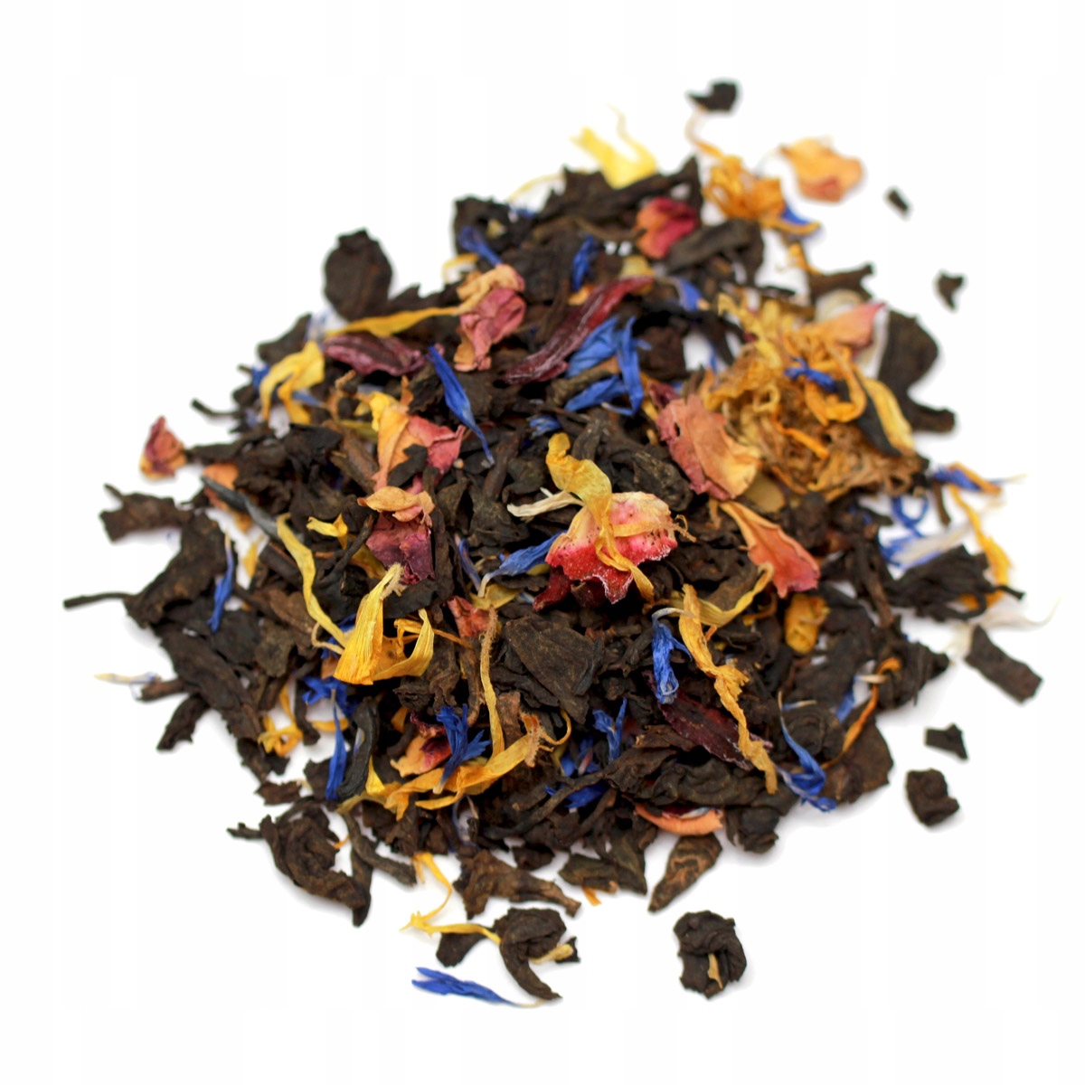 Состав чая: красный чай Пуэр, лепестки гибискуса, лепестки розы, ароматизатор, лепестки василька, лепестки бархатцев.