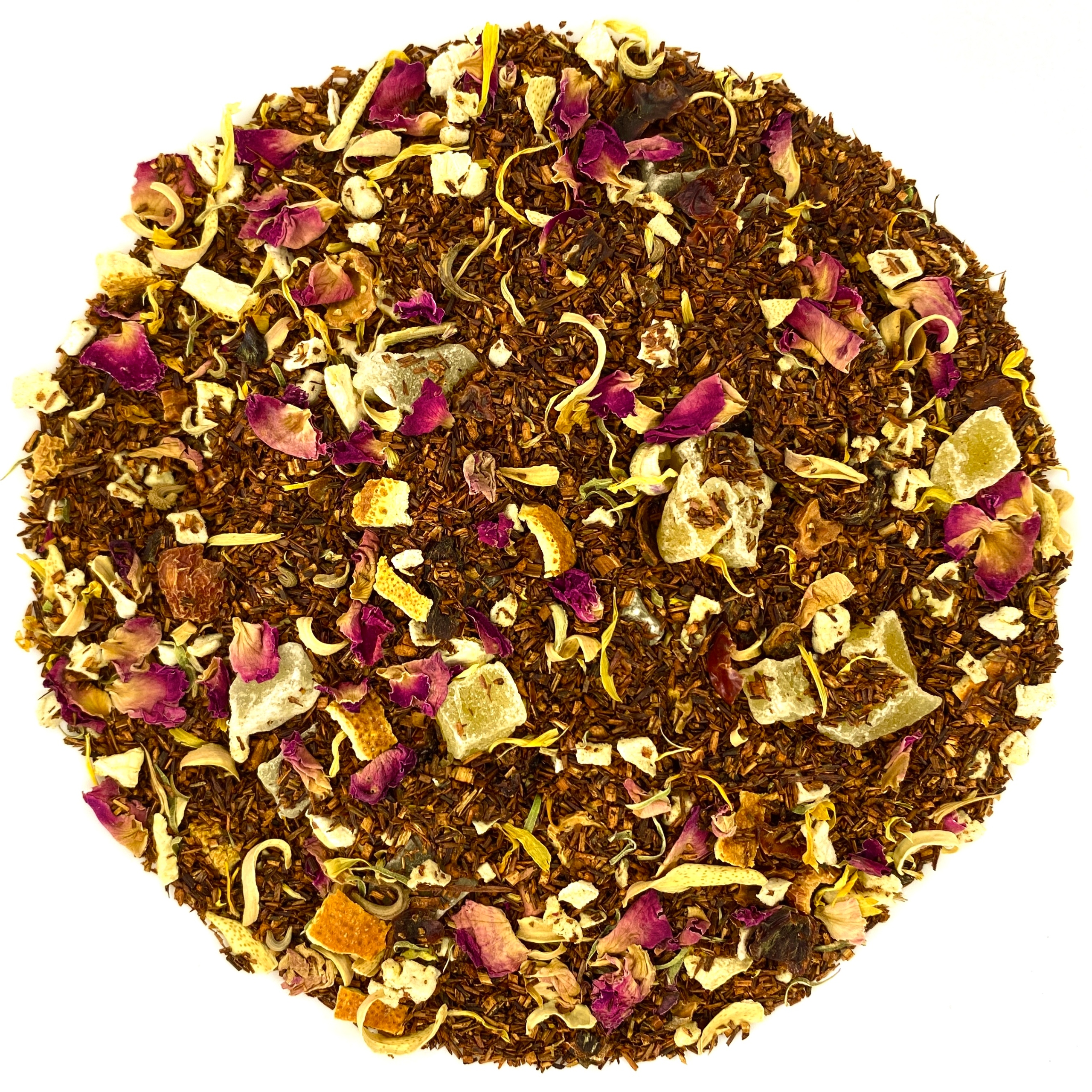 Чай ройбуш, манго, ананас, апельсин — отличный выбор для людей, которые хотят чувствовать себя расслабленными и спокойными. Свойства лаванды стимулируют расслабление и снимают напряжение, что в сочетании с успокаивающим действием ройбуша позволяет успокоиться и расслабиться