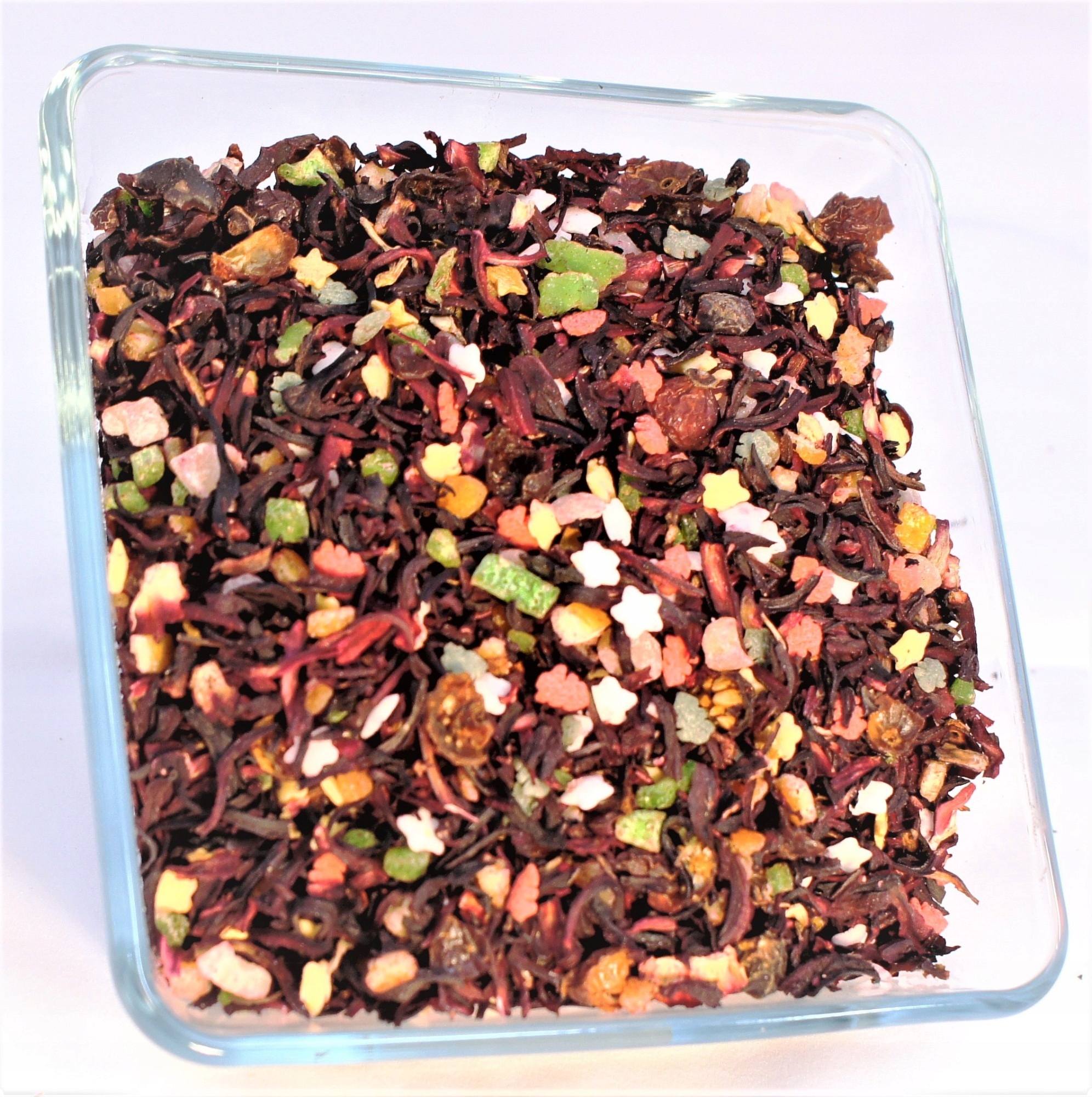 100г превосходного фруктового чая с большим количеством фруктов и выбранным составом: «Рождественское волшебство» или «Малина».
