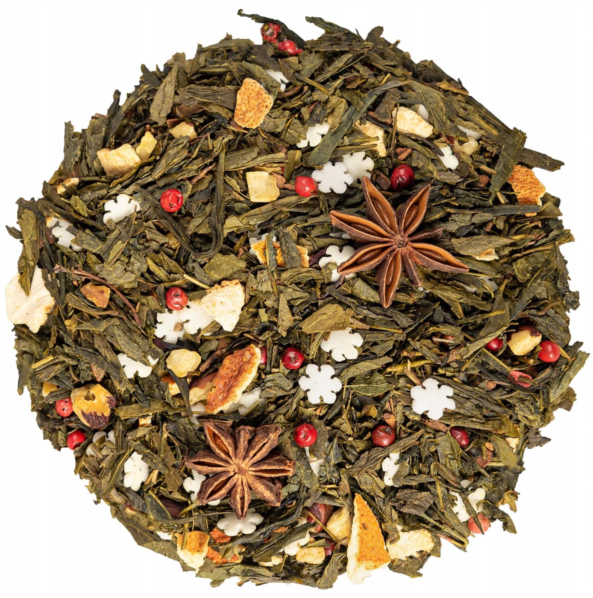 Этот рождественский зеленый чай сенча перенесет вас в волшебный мир Рождества. благодаря сладким украшениям из сахара, пикантной корицы и насыщенному вкусу фундука. Апельсиновая цедра придает освежающий акцент, а анисовый перец придает рождественский оттенок.