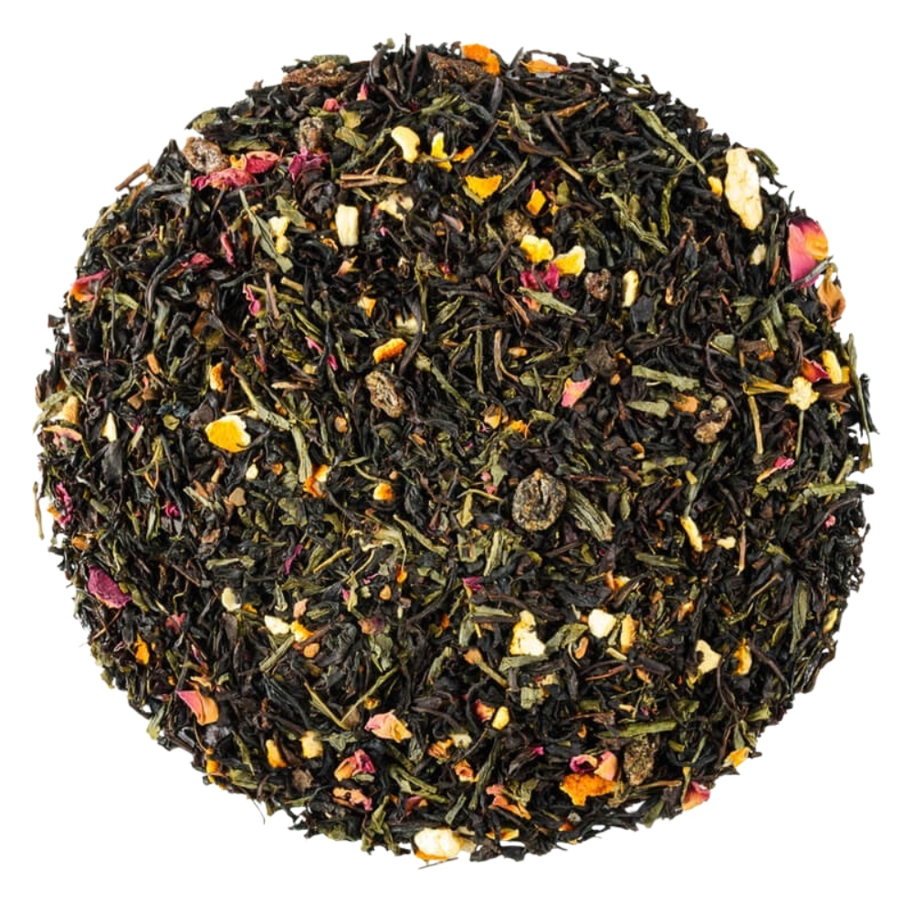 - Состав: Чай черный ОП, зеленый чай Сенча, изюм (изюм, растительное масло), цедра апельсина, корица, лепестки роз, ароматизаторы
