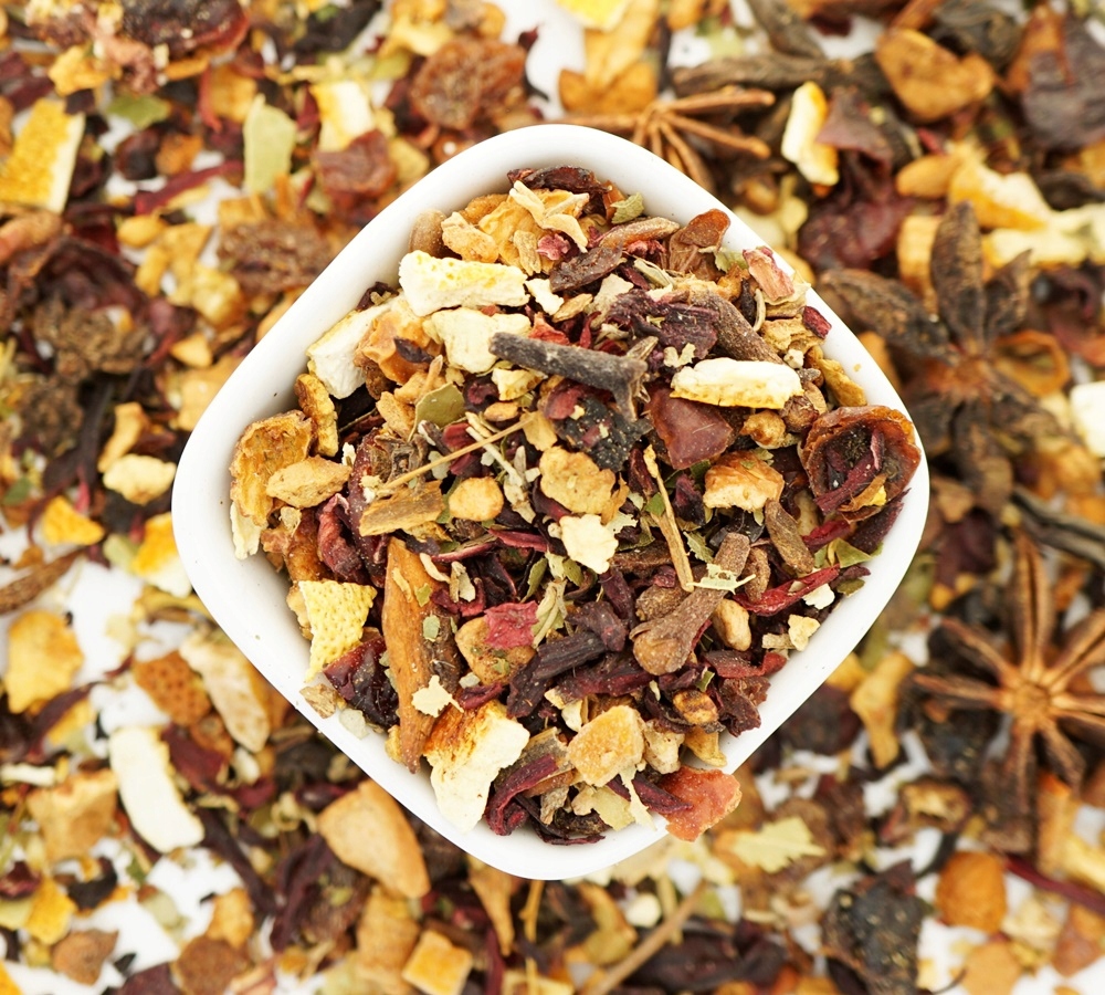 Глинтвейн 50 г - ингредиенты: гибискус, цедра розы, изюм, яблоко, липовый цвет, цедра апельсина, гвоздика, имбирь.
