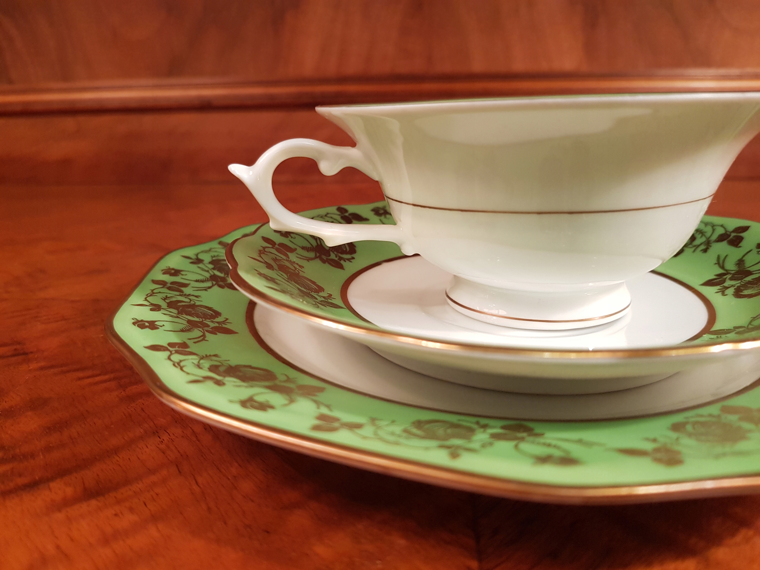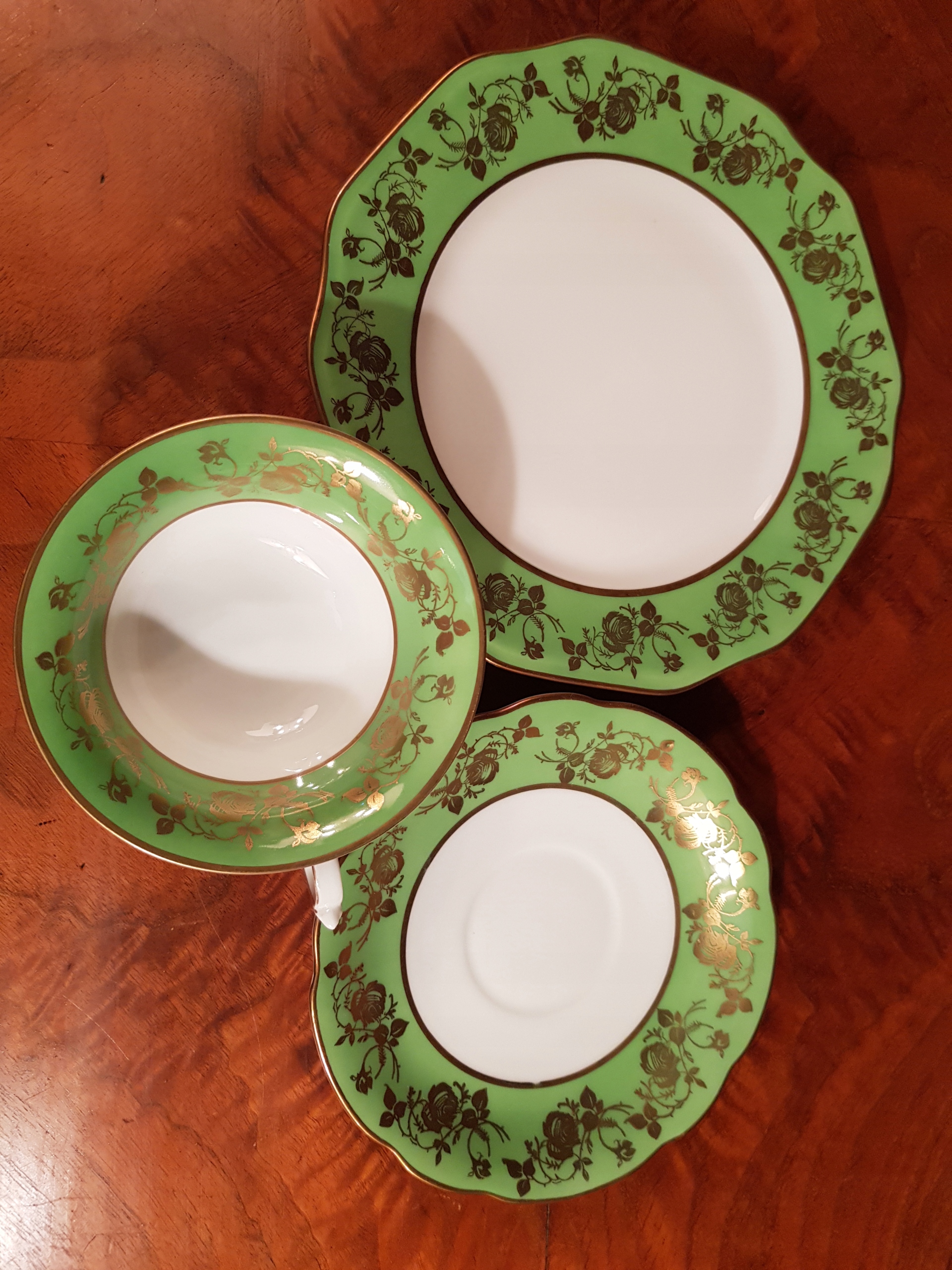 Белый фарфор, украшенный зеленой полосой с мотивом позолоченных роз. >