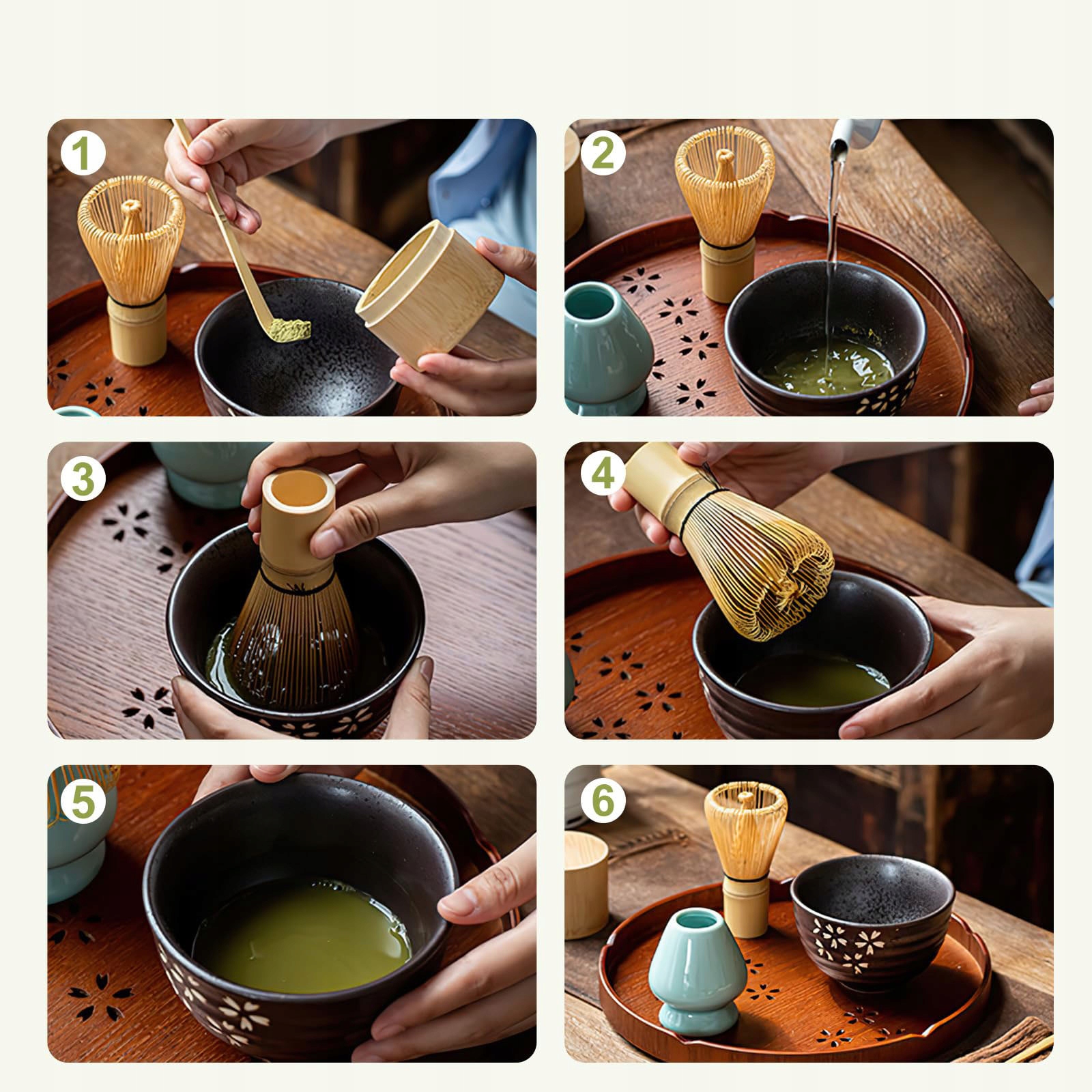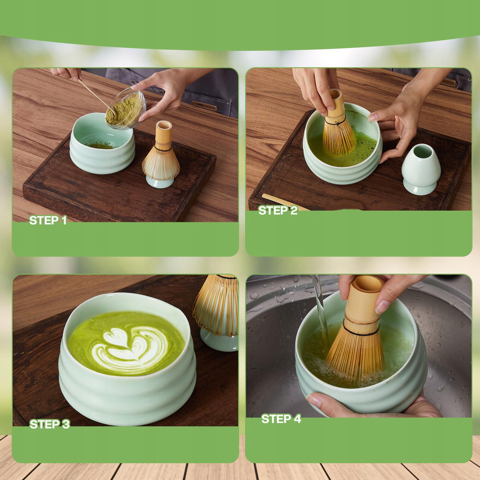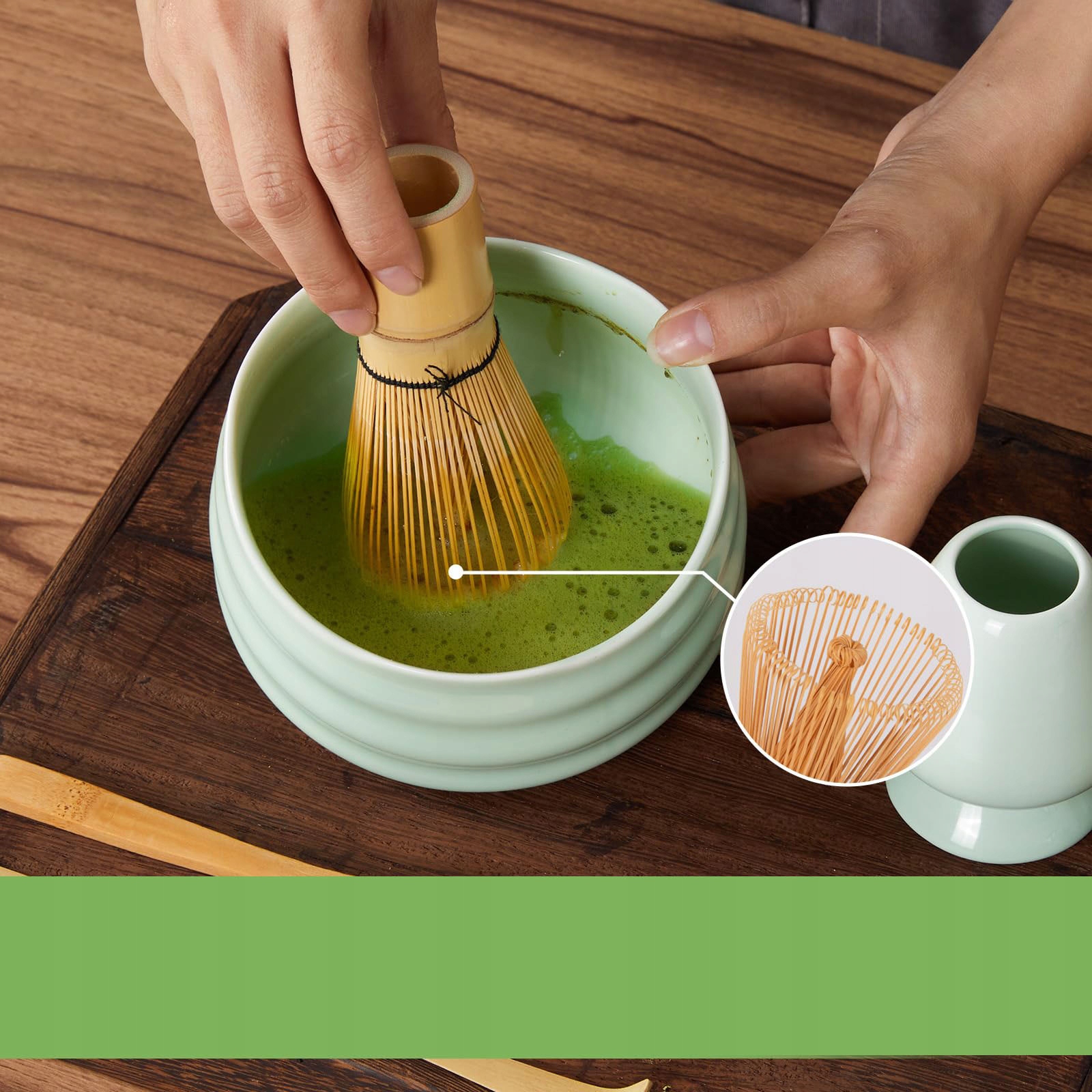 Набор чая матча: Этот набор чая матча включает в себя 1 чашу матча, 1 бамбуковую ложку, 1 бамбуковый венчик и 1 керамическую ручку венчика и отвечает всем вашим потребностям: от измерения порошка матча до смешивания матча. С помощью этого набора инструментов вы легко приготовите чашку насыщенного и нежного напитка матча. Будь то матча-латте, чай с молоком матча или смузи матча.