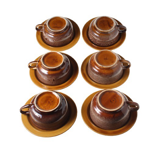 Из-за использованной техники окрашивания чашки и тарелки не идентичны по цвету. Никаких трещин, сколов и трещин. На эмали имеются точечные потертости, на пластинах - царапины от однократного использования. Две чашки немного легче остальных, и их чашки имеют немного более тонкие стенки. Пятнистый подглазурный слой в верхней части брюшка сахарницы.