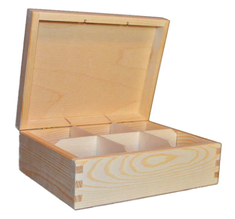 Деревянная заварочка на шесть отделений. Полностью из сосны, перегородки из фанеры. Он также отлично подходит для хранения украшений и мелких вещей. Коробка в необработанном состоянии, идеально подходит для украшения, среди прочего: Техника «ДЕКУПАЖ».