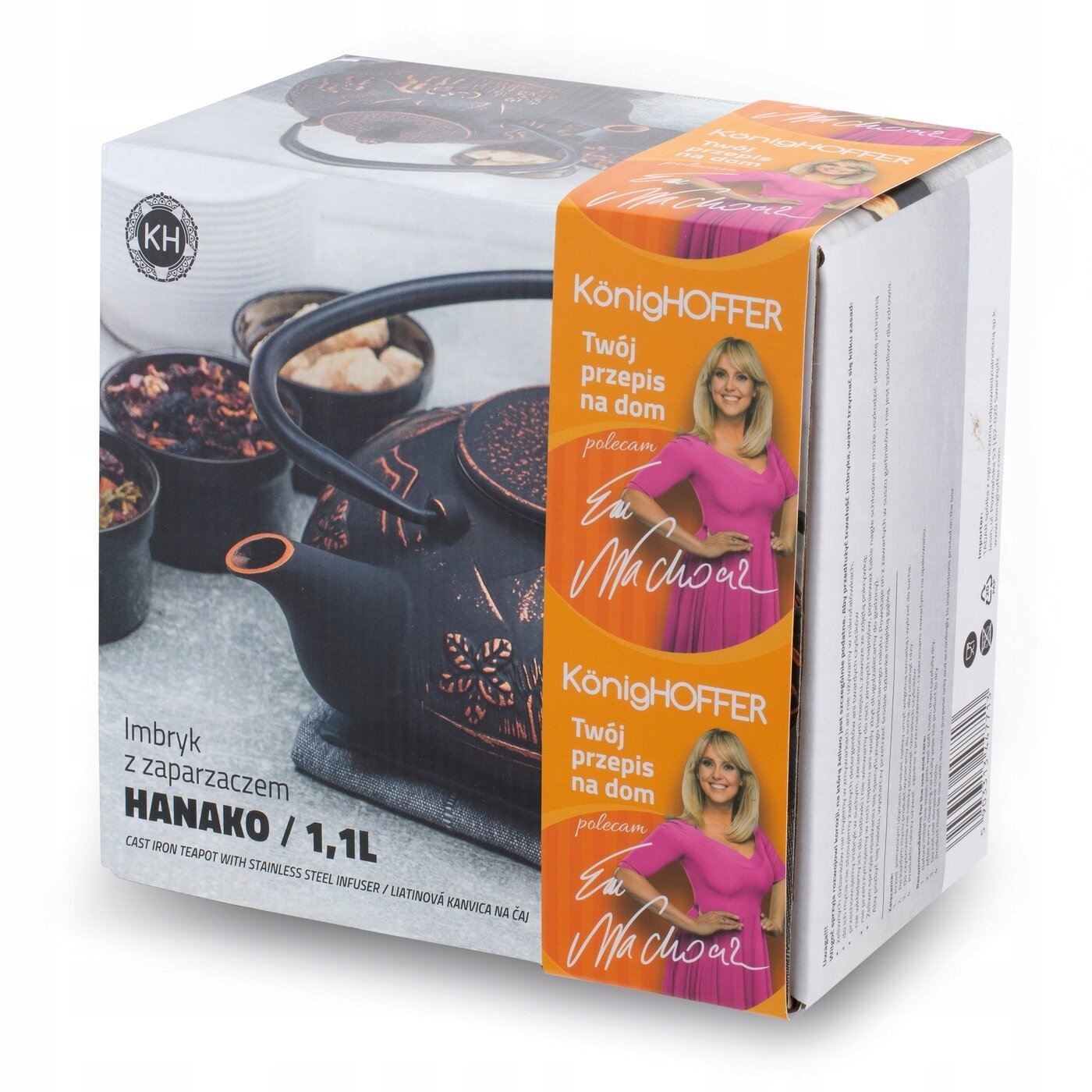 Черный чайник Konighoffer Hanako Słoń 1,1 л с заварочным устройством изготовлен из чугуна. В комплект также входит заварник из нержавеющей стали. Благодаря ему вы сможете отделить травы от кипятка и быстро прервать процесс заваривания эссенции. Внутренняя часть чайника покрыта нетоксичной эмалью. Это облегчит ваш уход и обеспечит пользу от настоя. Модель долго сохраняет тепло. Можно поставить на грелку (до 60 минут!). Большая ручка чайника позволяет легко переносить его и разливать чай в кружки и чашки. Крышка корпуса позволяет эффективно регулировать пар внутри. Продукт рекомендует Ева Вахович. Как амбассадор бренда Konighoffer, она горячо и с улыбкой рекомендует его для домашнего использования. Вместе с ним вы получите свой рецепт для дома. Это один из лучших вариантов в этой категории!