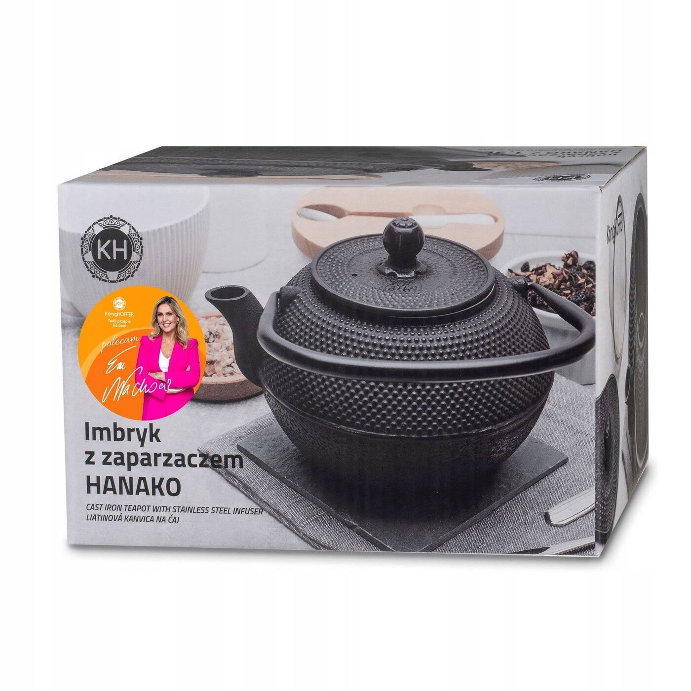 Черный чайник Konighoffer Hanako объемом 1,2 л с заварочным устройством изготовлен из чугуна. В комплект также входит заварник из нержавеющей стали. Благодаря ему вы сможете отделить травы от кипятка и быстро прервать процесс заваривания эссенции. Внутренняя часть чайника покрыта нетоксичной черной эмалью. Это облегчит ваш уход и обеспечит пользу от настоя. Модель долго сохраняет тепло. Можно поставить на грелку (до 60 минут!). Большая ручка чайника позволяет легко переносить его и разливать чай в кружки и чашки. Крышка корпуса позволяет эффективно регулировать пар внутри. Продукт рекомендует Ева Вахович. Как амбассадор бренда Konighoffer, она горячо и с улыбкой рекомендует его для домашнего использования. Вместе с ним вы получите свой рецепт для дома. Это один из лучших вариантов в этой категории!