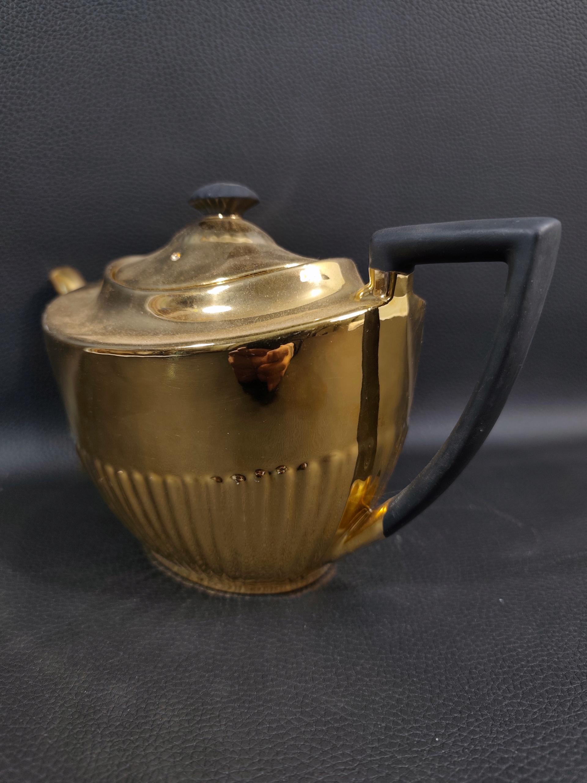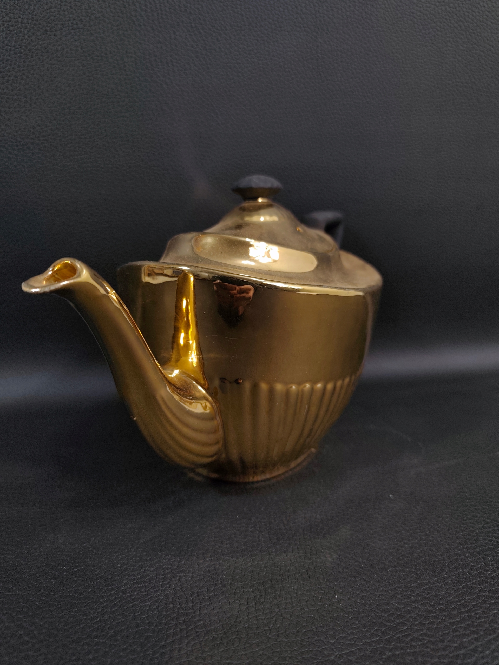 - Описание: Это большой керамический чайник с зеркально-золотой отделкой (люстр) и контрастными черными элементами, такими как ручка и ручка крышки, которые обычно изготавливаются из бакелита. Характеризуется специфической бочкообразной формой с изящными вертикальными бороздками в нижней части.