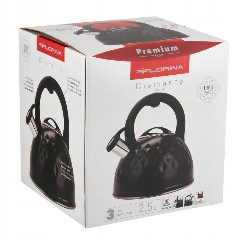 Крышка и ручка покрыты шелковым сенсорным покрытием, которое не нагревается, а также нежное и твердое на ощупь, что гарантирует безопасность использования. В ручке использован практичный механизм — наклоняемый свисток, который облегчает наливание воды в чашки или стаканы. Стоит подчеркнуть, что чайник Diamante подходит для индукции и имеет, что очень важно, большую емкость (2,5 литра полезная и 3 литра общая). Идеально подходит для каждой семьи.