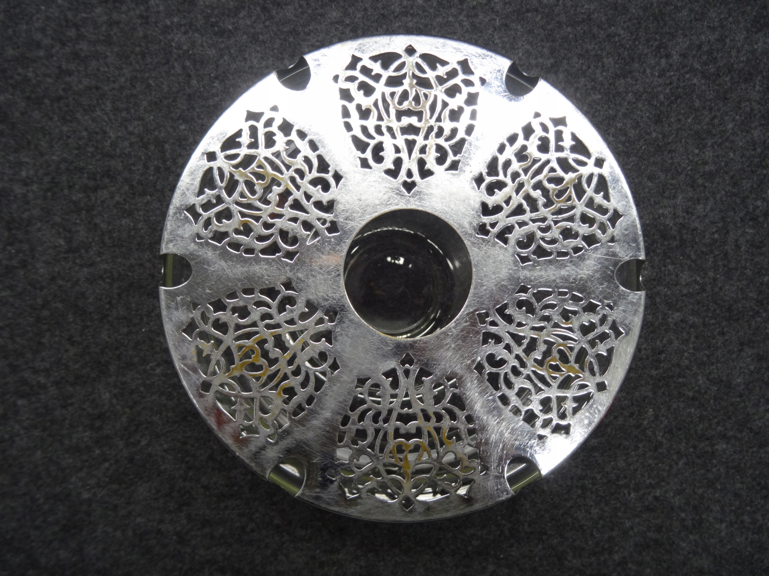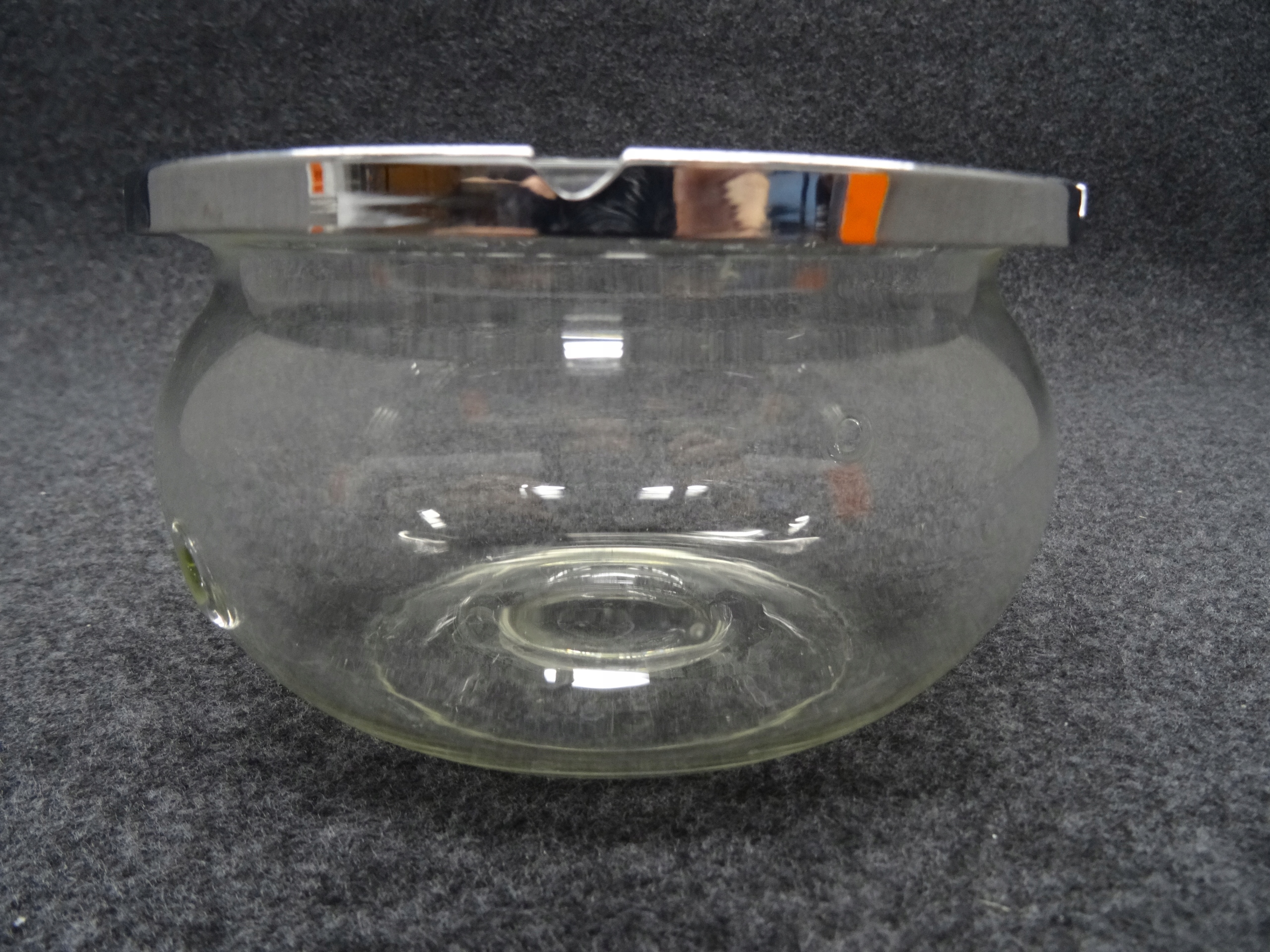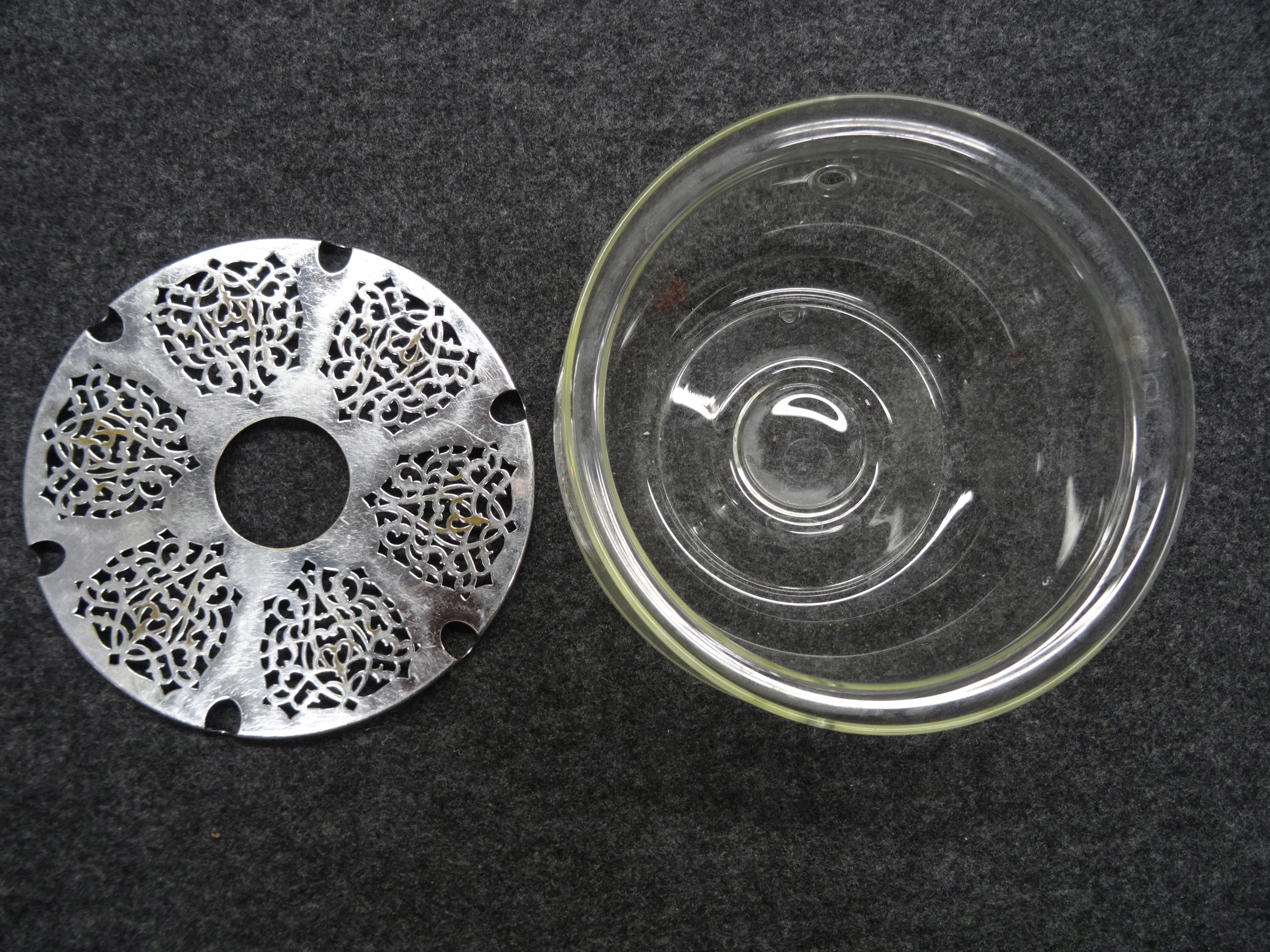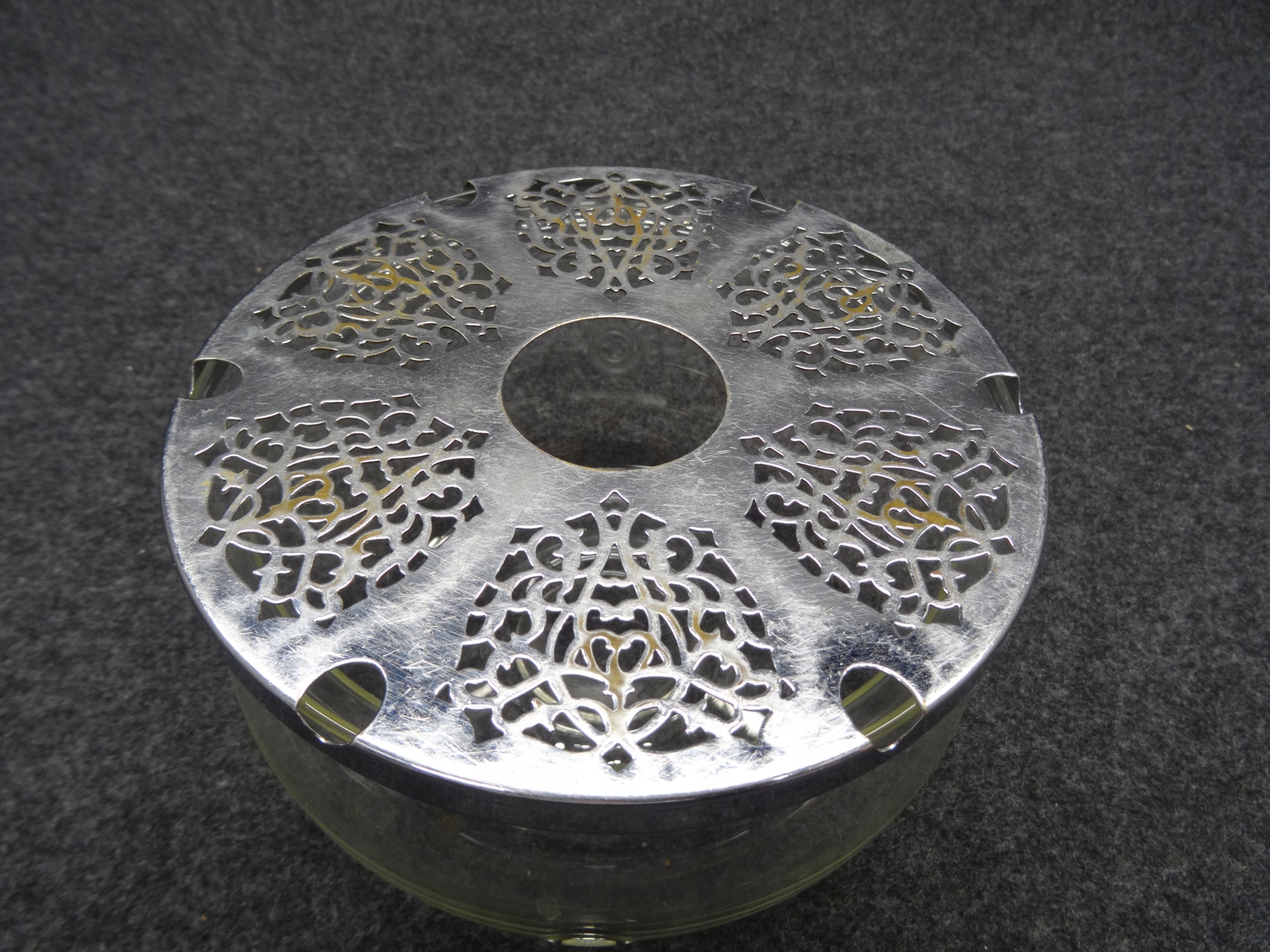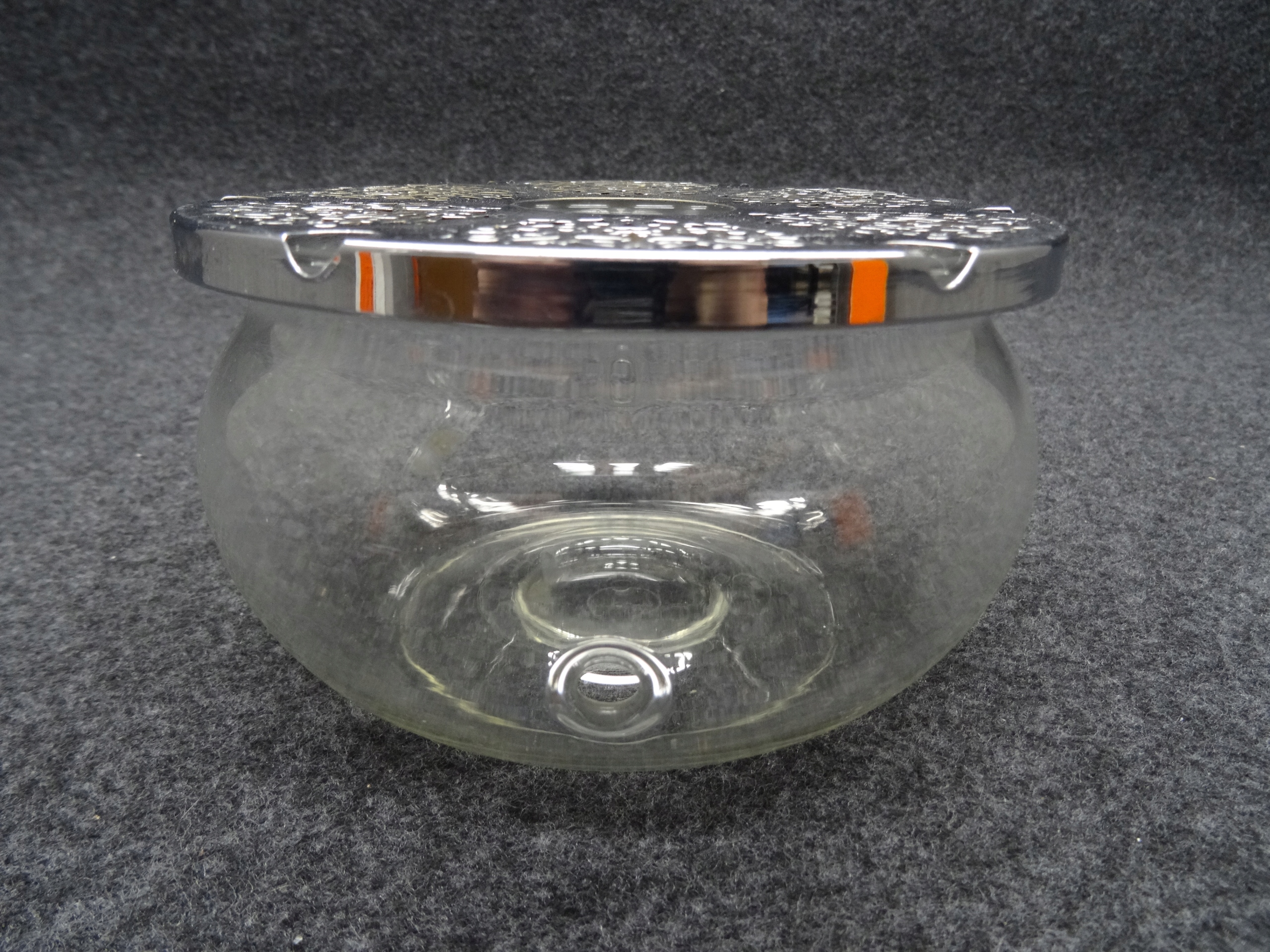 Стеклянный чайный нагреватель для вставки Tealight, металлическое дно, которое не привлекает магнит. По бокам резервуара вытянуты два отверстия. Состояние, как на фотографиях.
