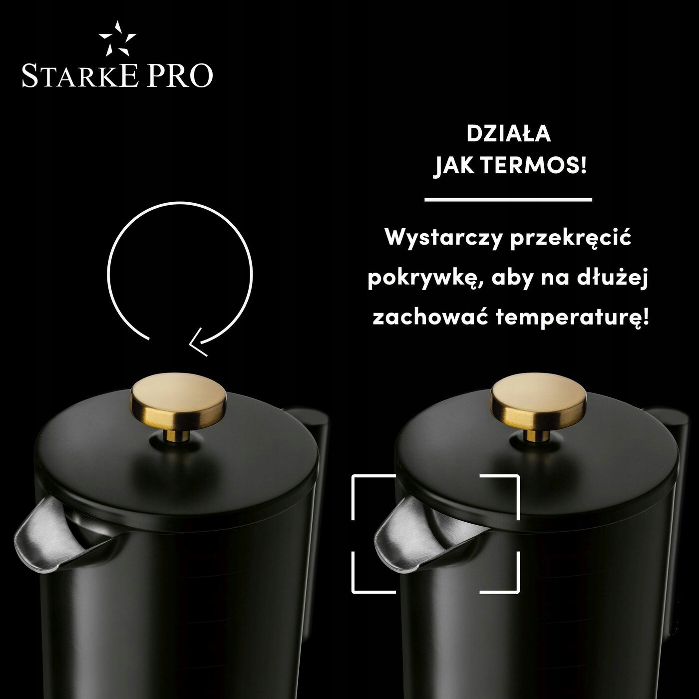 Поршневая пивоварня Starke Pro Ultime объемом 1 л элегантна и современна. Он изготовлен из высококачественной нержавеющей стали, поэтому прочный. В нем удобно можно приготовить кофе или чай для нескольких человек. Вы также можете легко отделить гущу и влажные листья от заваренного напитка. Вы получите френч-пресс, который позволяет дольше поддерживать высокую температуру содержимого, поскольку имеет двойные стенки. Такое решение и эргономичная ручка очень хорошо защитят вас от случайных ожогов рук. Таким образом, вы обеспечите безопасность и удобство налива кофе и чая из кофеварки Ultime. Дополнительно вы можете дополнить свой кофейный набор стильным кувшином для заваривания напитков. Все благодаря матовой черной отделке и золотым деталям.