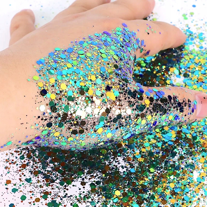 - Мода и аксессуары: превратите обычные аксессуары в уникальные предметы с помощью толстых голографических блесток. Их можно использовать на обуви, сумках, аксессуарах для волос и одежде, чтобы создать уникальный и сверкающий образ.