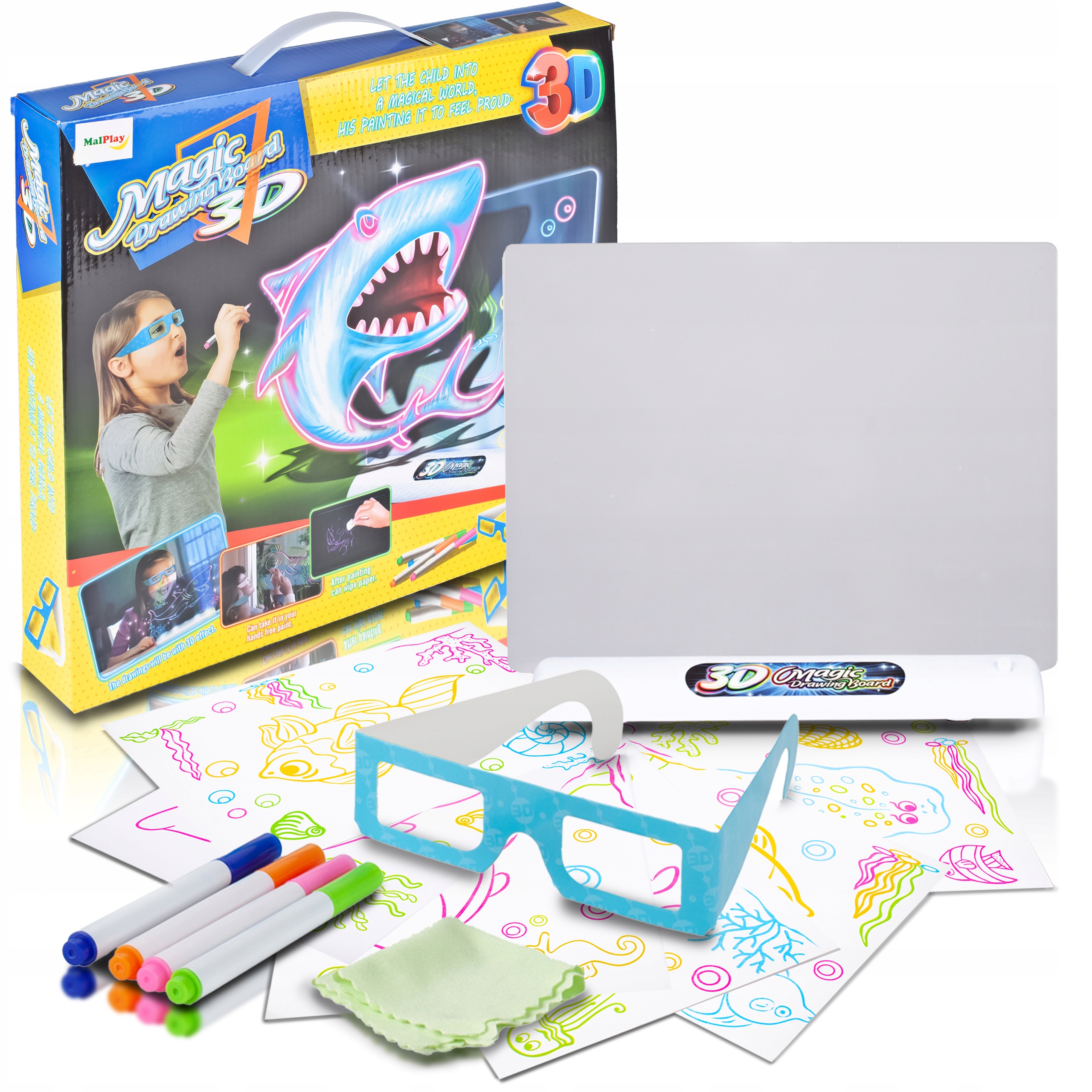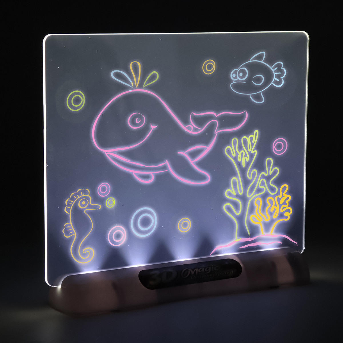 На прозрачной доске просто нарисуйте любое изображение флуоресцентными маркерами, поставьте его в подставку с подсветкой, включите, наденьте очки, входящие в комплект, и любуйтесь.