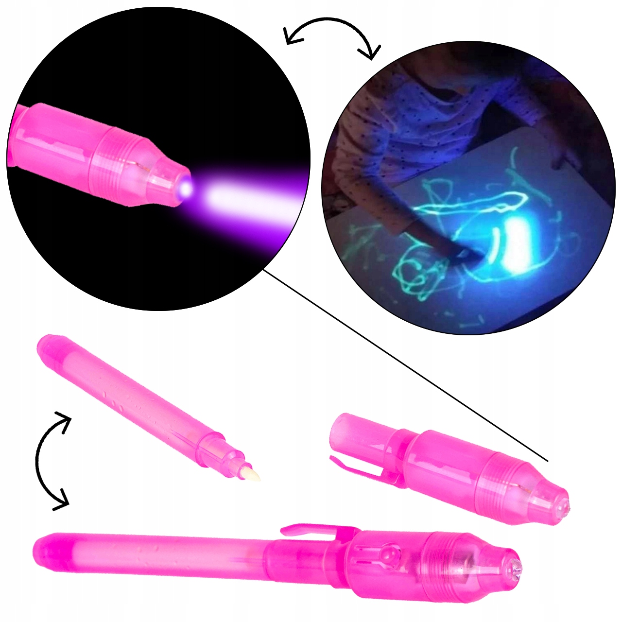 Колпачок ручки служит крышкой, а также имеется встроенная УФ-лампа для рисования светом. Благодаря этому вы сможете создать секретное послание, видимое только в темноте.