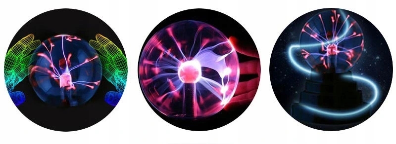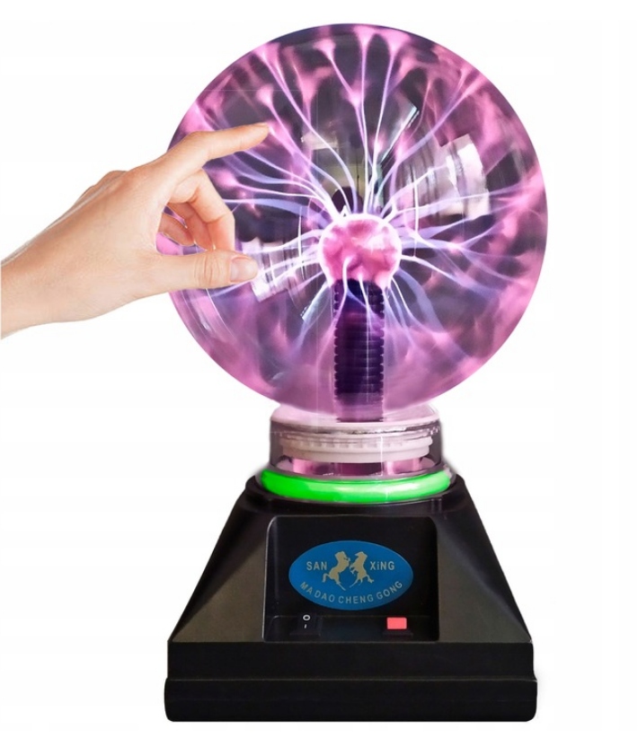 При прикосновении к стеклянной поверхности шара При пальце возникают ленты электрических разрядов, которые стекаются к нему, создавая потрясающий эффект. Шаризготовлен из стекла на пластиковой основе. Питается от сети напряжением 230 В.