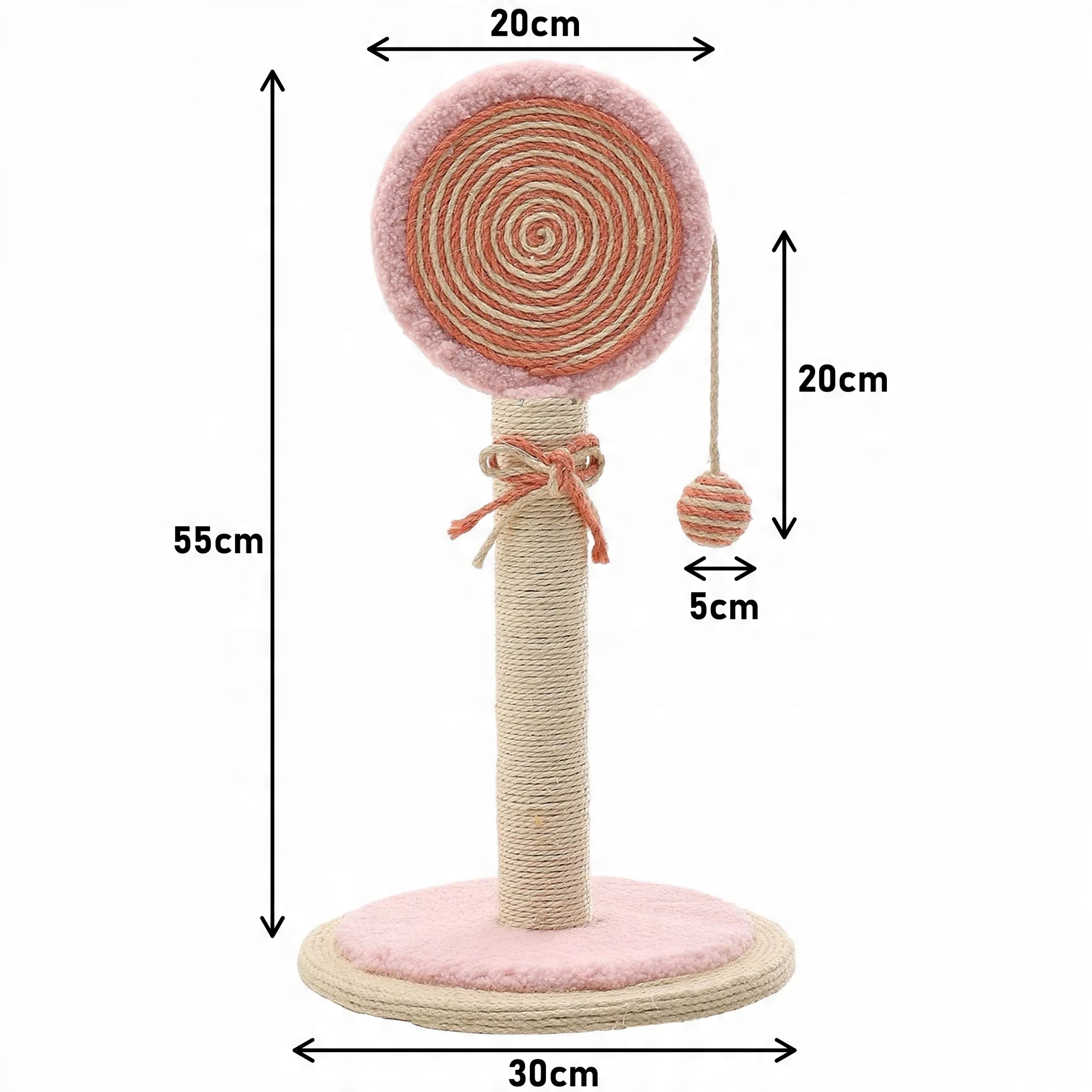 - Широкий леденец из сизаля — удобная поверхность для когтеточки: Верхняя часть когтеточки, выполненная в виде розового леденца, также изготовлена из сизаля, что позволяет кошке широко царапаться. поверхность и повышает комфорт использования.