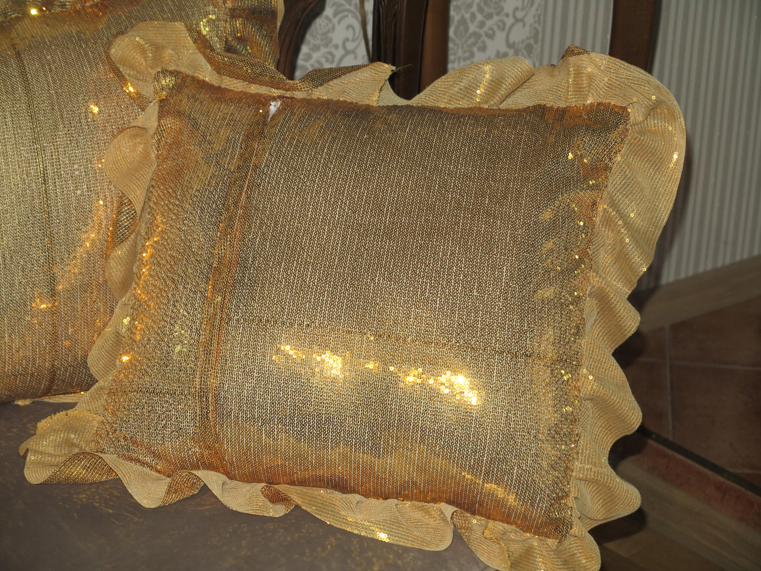 НАБОР ПРЕКРАСНЫХ ЗОЛОТЫХ НАВОЛОЧОК ИЗ ТКАНИ ПО ИНДИВИДУАЛЬНОМУ ИЗГОТОВЛЕНИЮ С МАЛЕНЬКИМИ ПАЙЕТКАМИ. ВОКРУГ ОФОРМЛЕНО БОЛЬШИМ РАЛЛАНСОМ