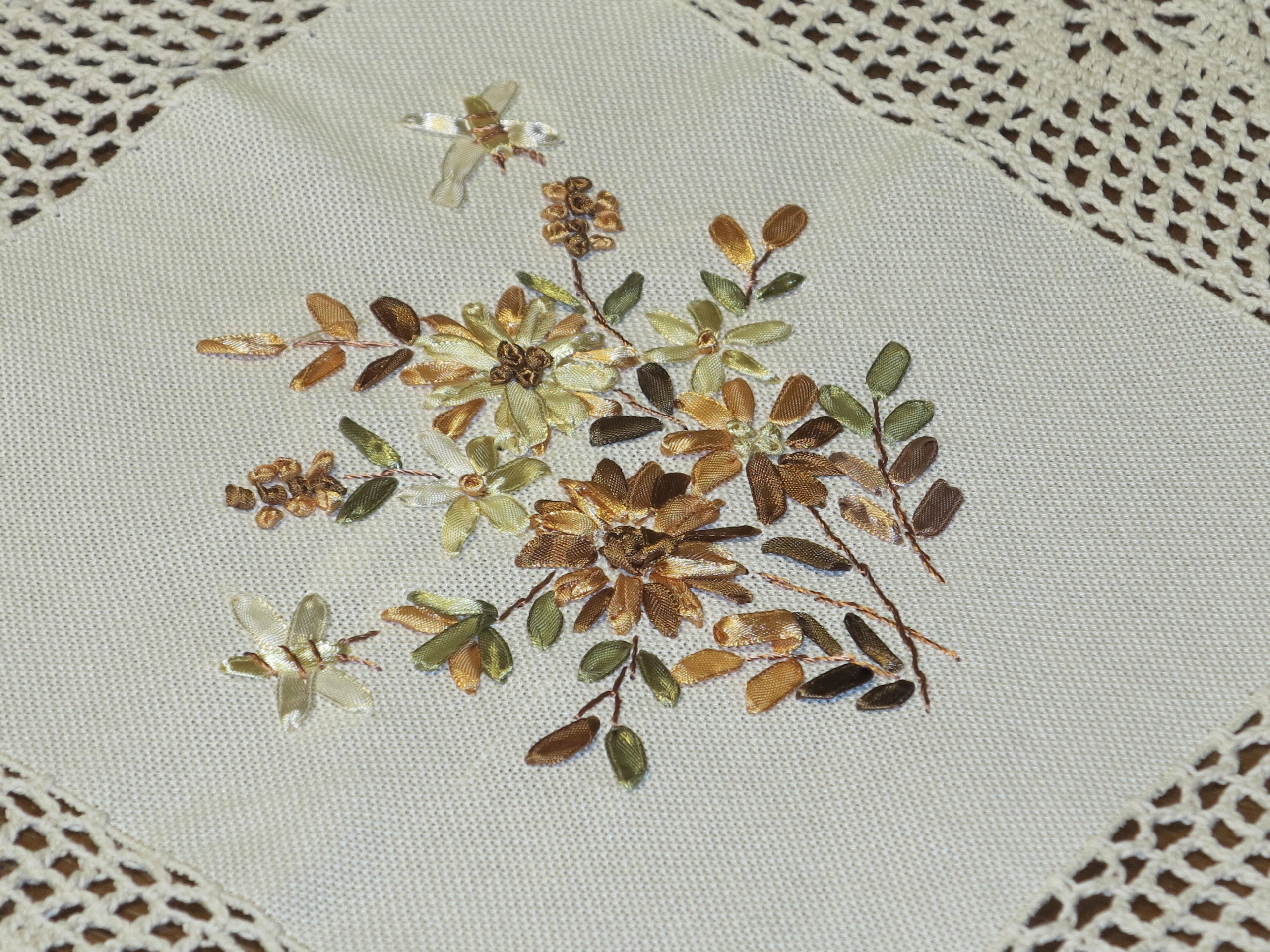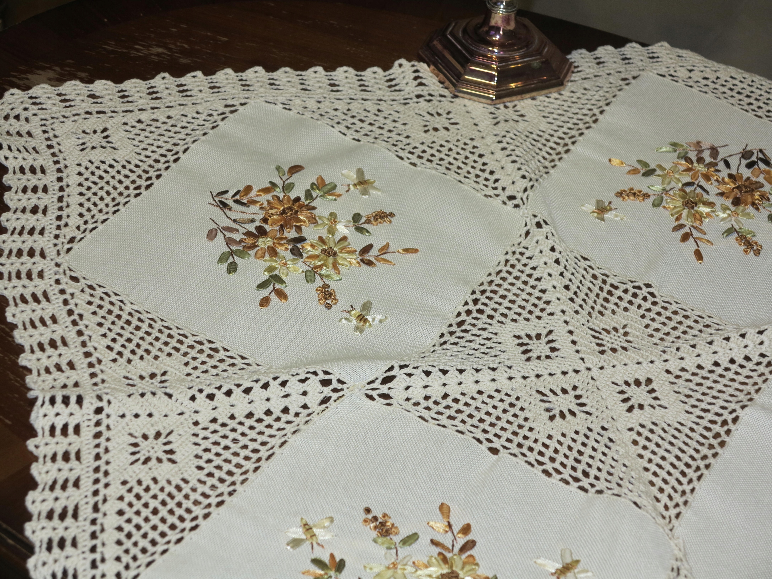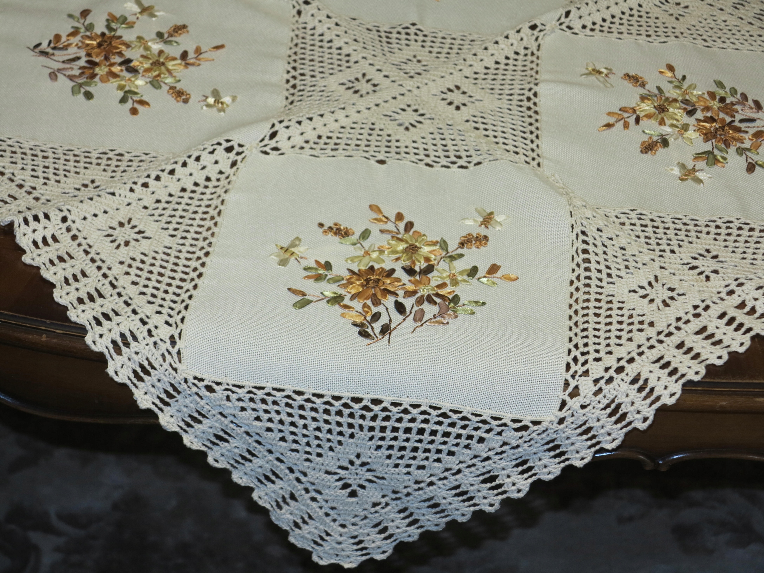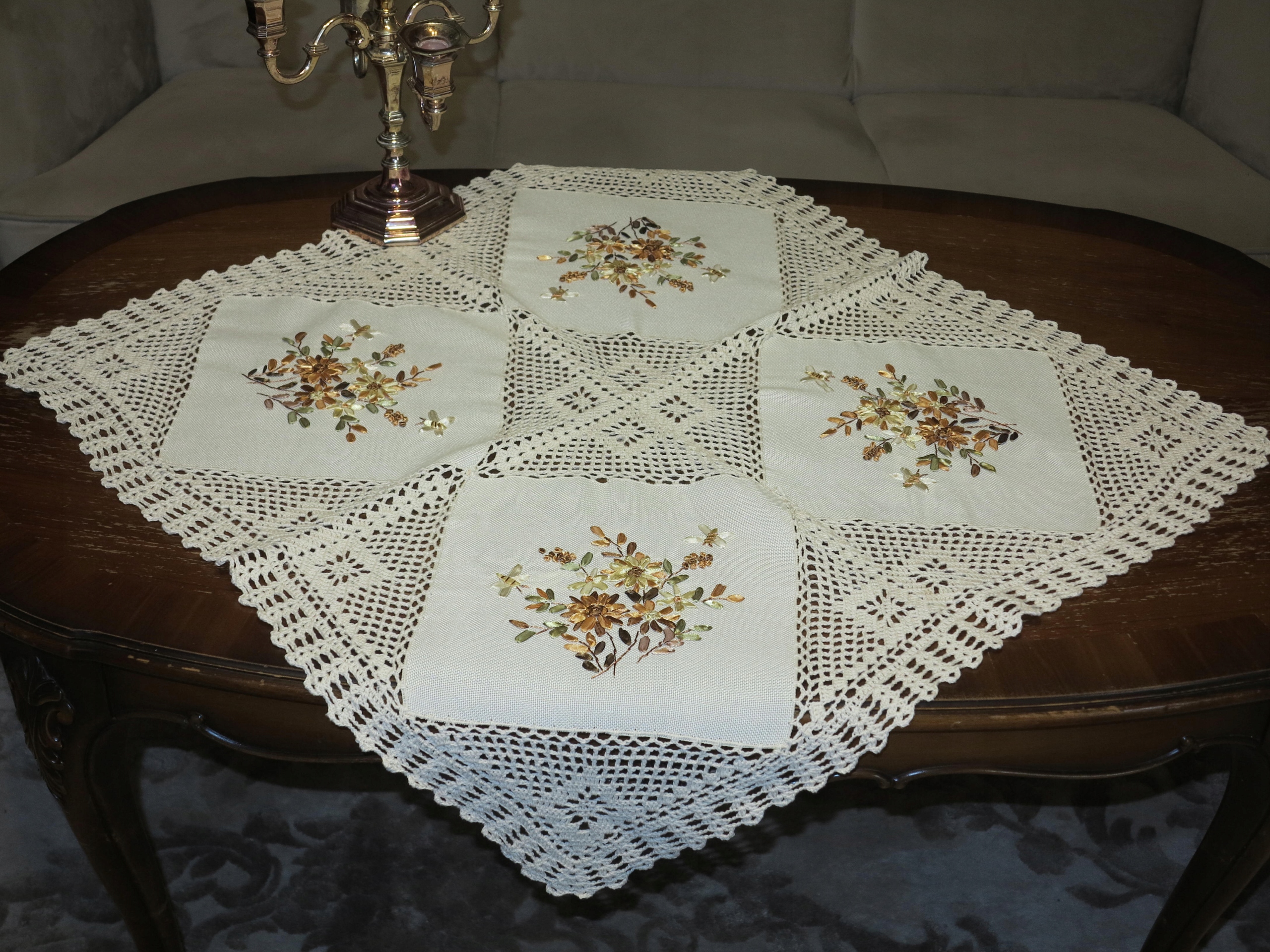 Тема аукциона - красивая скатерть, комбинация вязания крючком и холста с конической вышивкой. Это выглядит красиво на столе. Он имеет размеры: 84/84 см. Используется в супер хорошем состоянии. Я рекомендую.