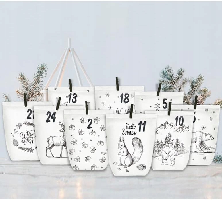 Календарь Рождественский набор бумажных пакетов с 24 белыми и черными подарочными пакетами. Сумки с пришествием с поперечным дном имеют 10 дизайнов.