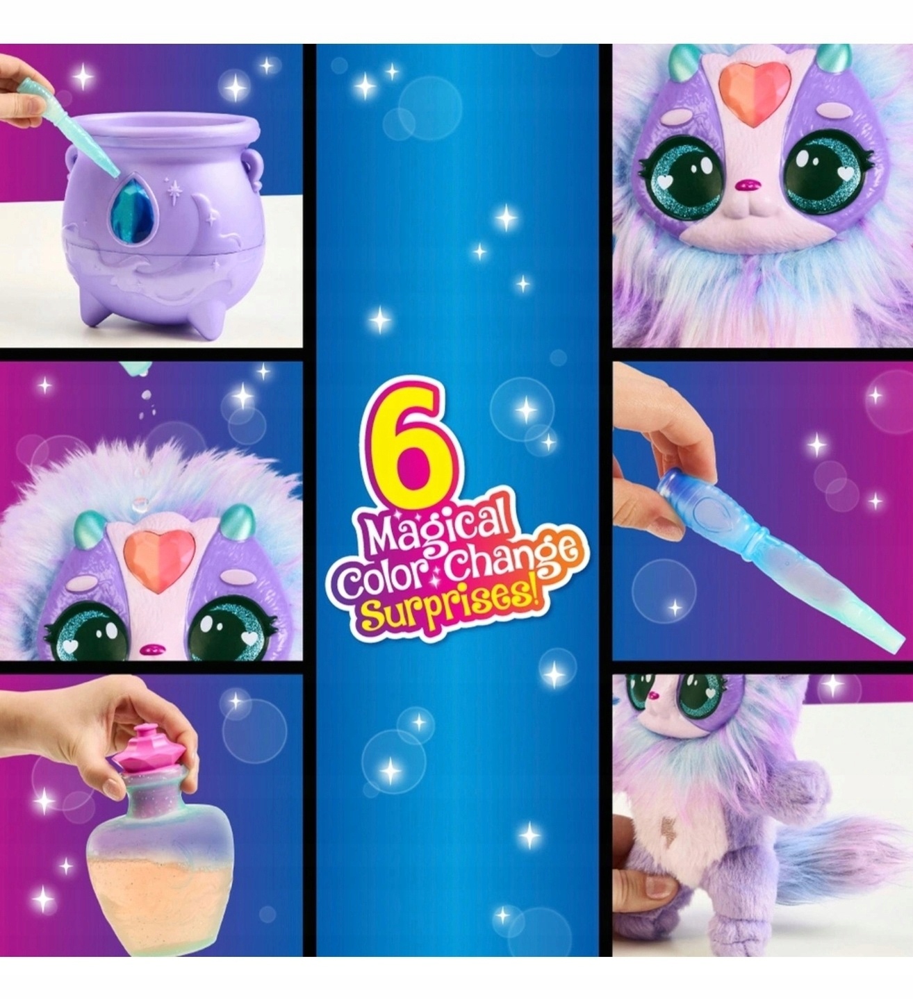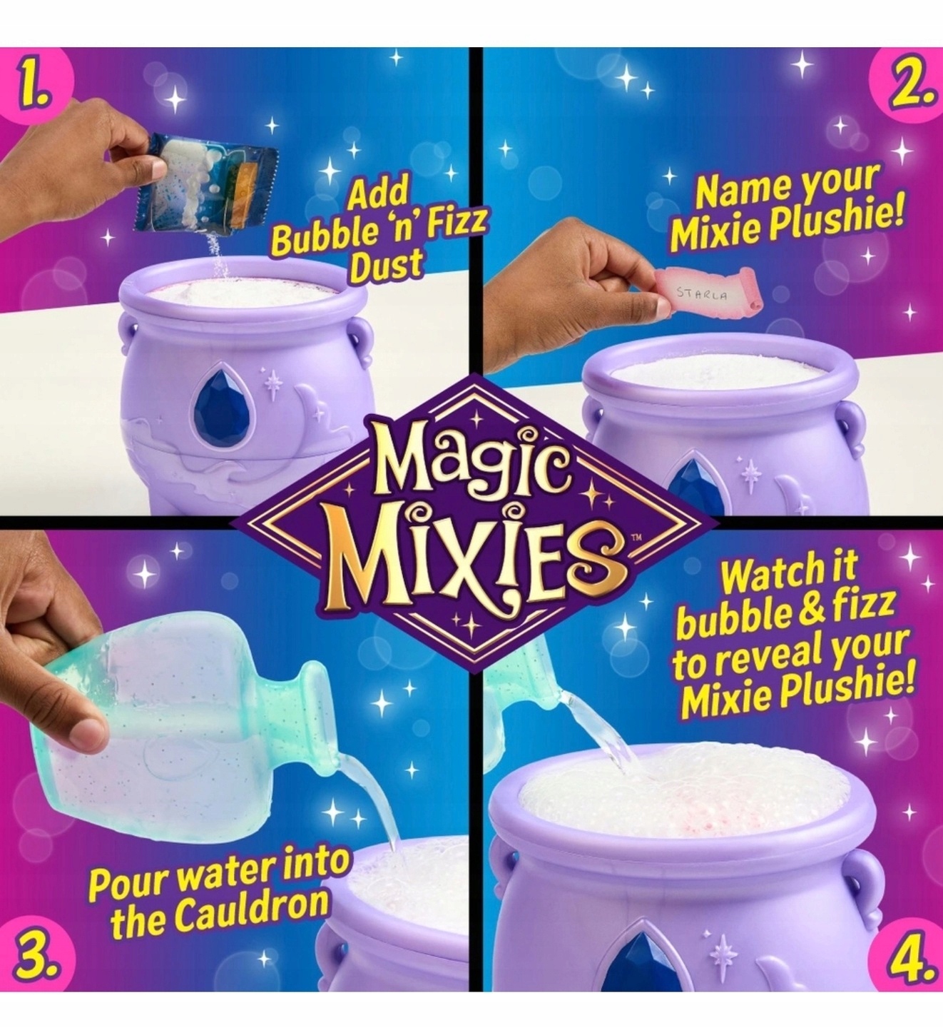 Магия начинается с того, что в котел засыпают шипучий порошок. Затем назовите свою смесь, написав ее на бумаге и бросив в котел. Добавьте воды и наблюдайте, как котел пузырится и шипит, а затем откройте для себя невероятно очаровательную мягкую игрушку Микси и другие волшебные сюрпризы внутри.